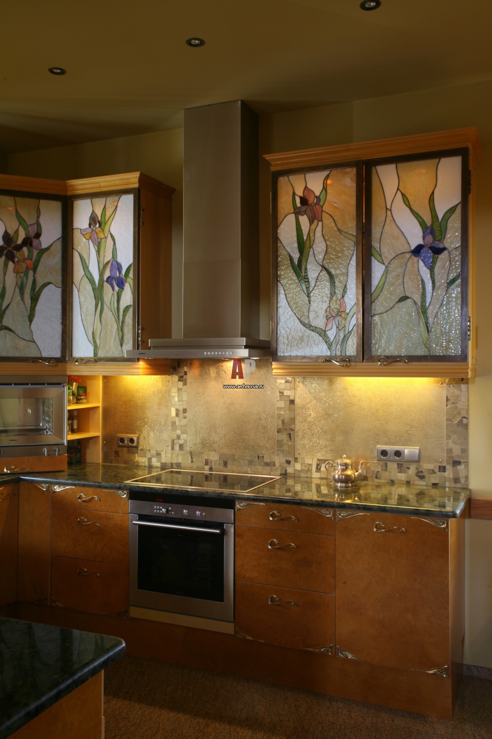 «Начинка» кухонной мебели – немецкая, фасады же выполнены на заказ по эскизам декоратора. Дверцы нижних шкафов сделаны из шпона корня клена в «Реставрационные мастерские Русского музея». Верхние дверцы – это витражное стекло с изображением ирисов, изготовление «Александрия».
