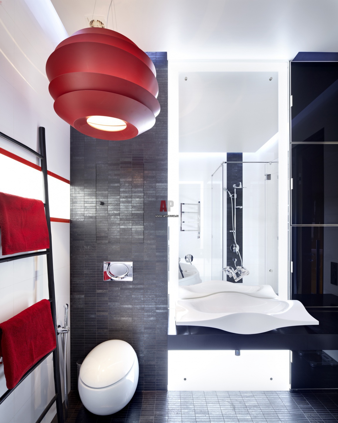 Фото интерьера санузла квартиры в стиле фьюжн. Раковина оригинальной волнообразной формы.