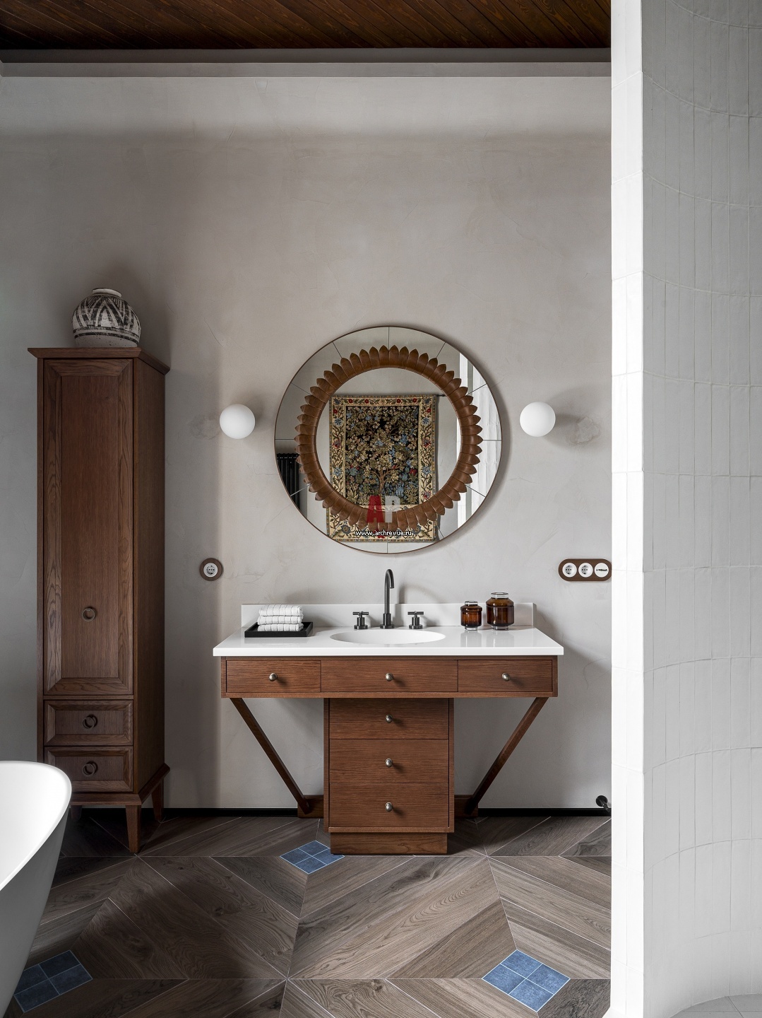 Хозяйская ванная комната. Тумба под раковину и шкаф, на заказ. Стены оформлены микроцементом, OUtstaff cement. Смесители, Fima Carlo Frattini.