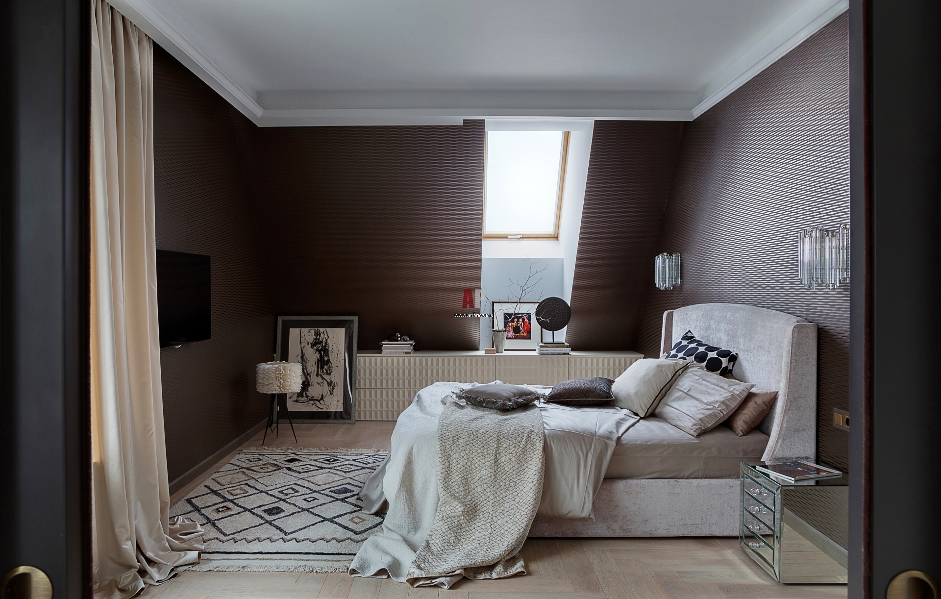 Спальня находится в помещении с мансардным окном. Люли шоколадного цвета, Omexco. Лепной декор из гипса, Atelier Sedap. Кровать, Estetica. Бра, люстра, прикроватные тумбы, Eichholtz.