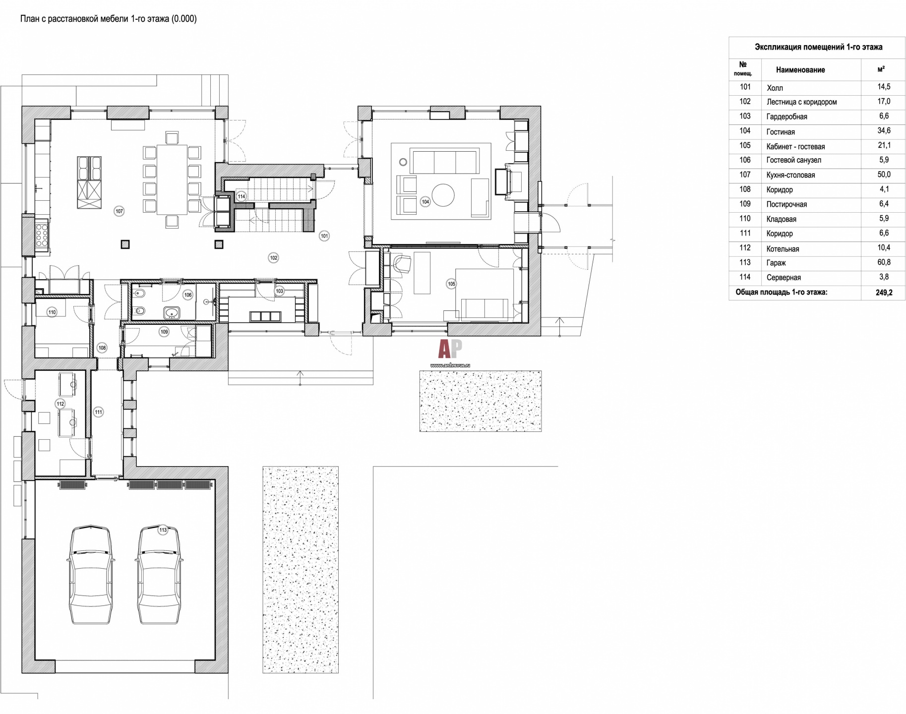Планировка 1 этажа 2-х этажного семейного коттеджа в Подмосковье.