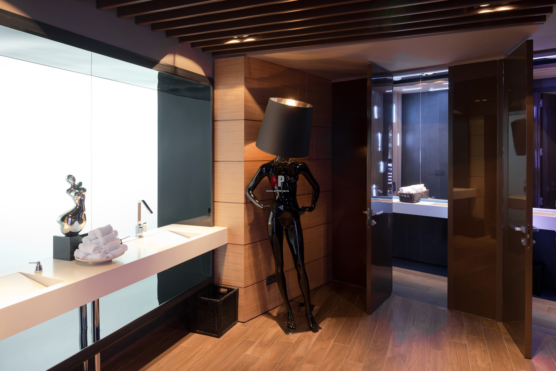 Интерьер санузла ресторана в современном стиле. Стена за раковинами декорирована панелями из матового стекла. Декоративная подсветка на стенах и потолке.