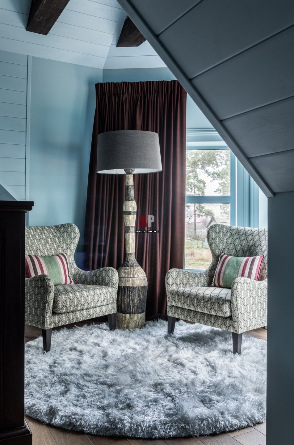 В эркере сделана зона отдыха. Торшер с керамическим основанием выполнен по эскизам дизайнера. Портьеры из шерсти, The Isle Mill.