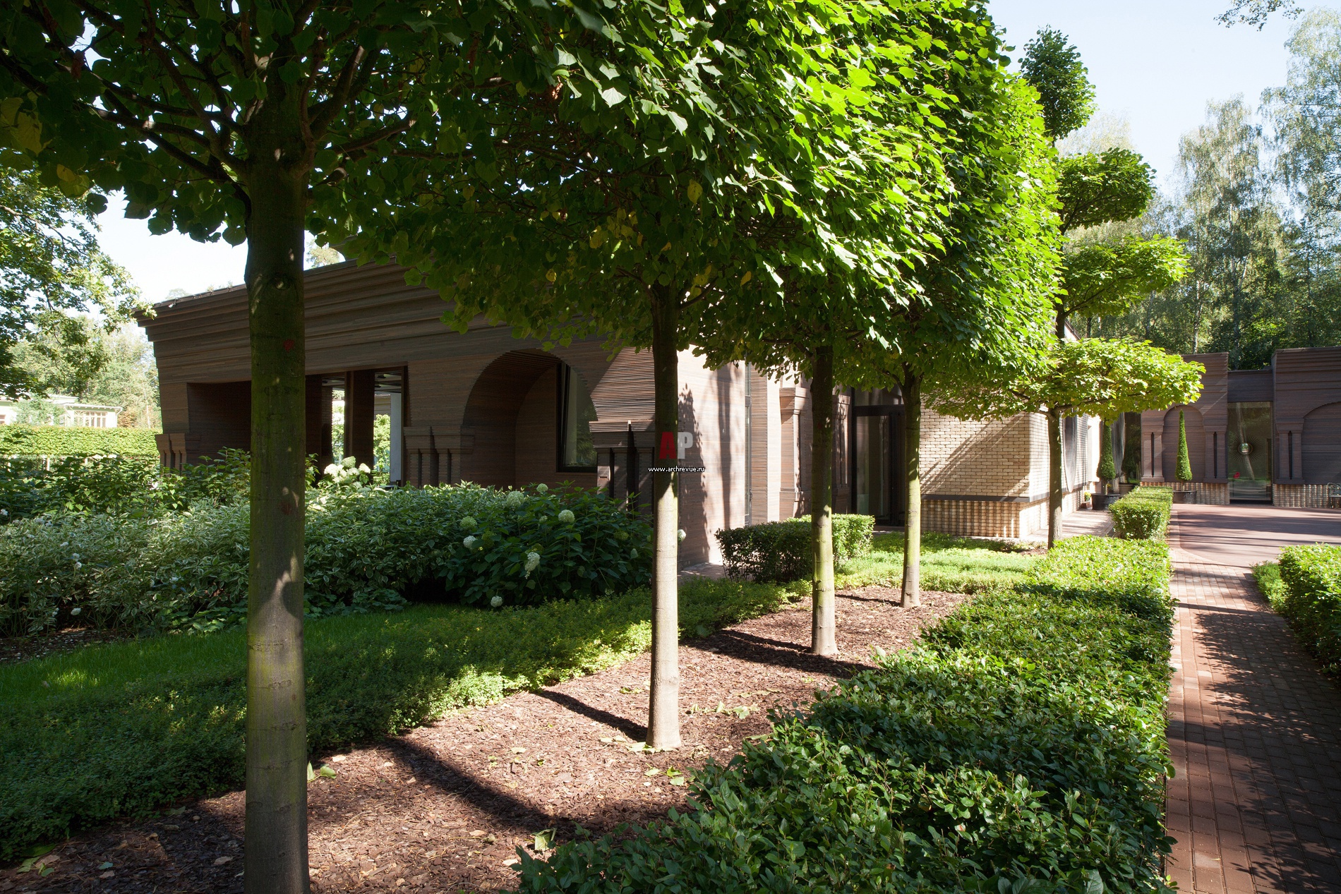 Помимо подбора растений, думали и о характере строительных материалов: они также соответствуют дому. Подъездная дорога выполнена из коричневого асфальта, дорожки из цементной плитки, а тропинки отсыпаны галькой. В самых тенистых зонах, под плотными кронами деревьев, где даже газон, как следует, не растет, почва замульчирована щепой красивого коричневого оттенка.
