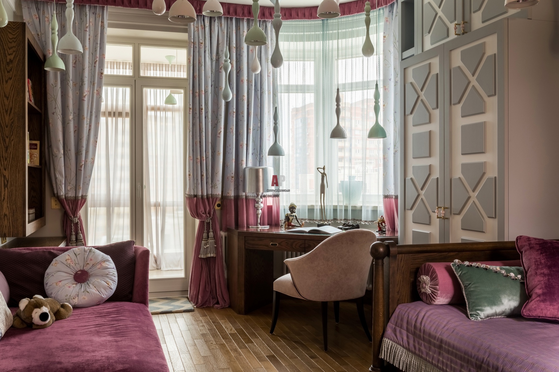 Детская комната в сливово-лавандовой палитре. Шкафы, деревянная кровать, стол, стеллажи сделаны по чертежам. Потолочные светильники и настольная лампа, Masiero. Паркет штучный, дуб, Bentline, «Мир Паркета».