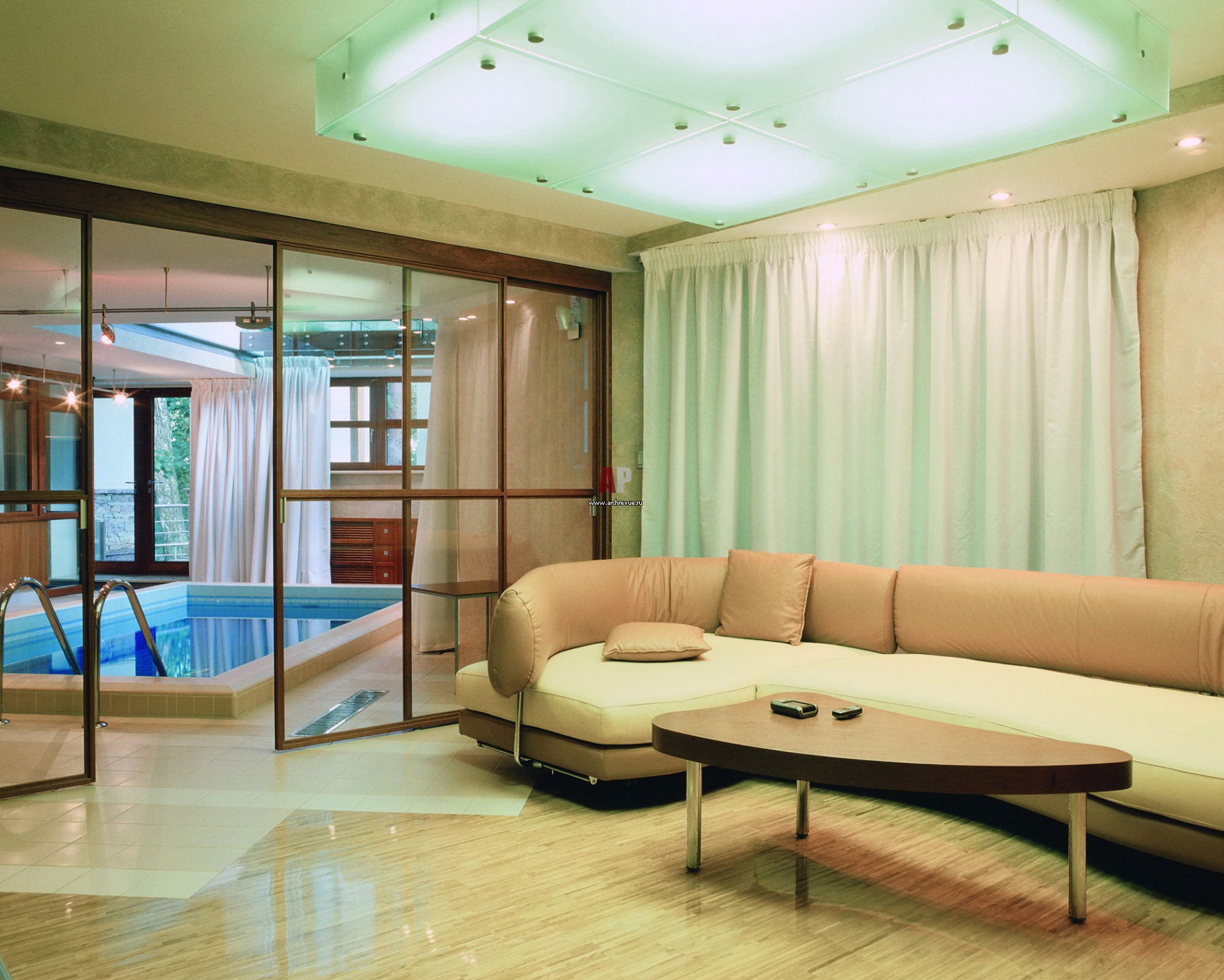 Комната отдыха при бассейне. От плавательного бассейна она отделена раздвижными стеклянными дверями с тонким деревянным переплетом.