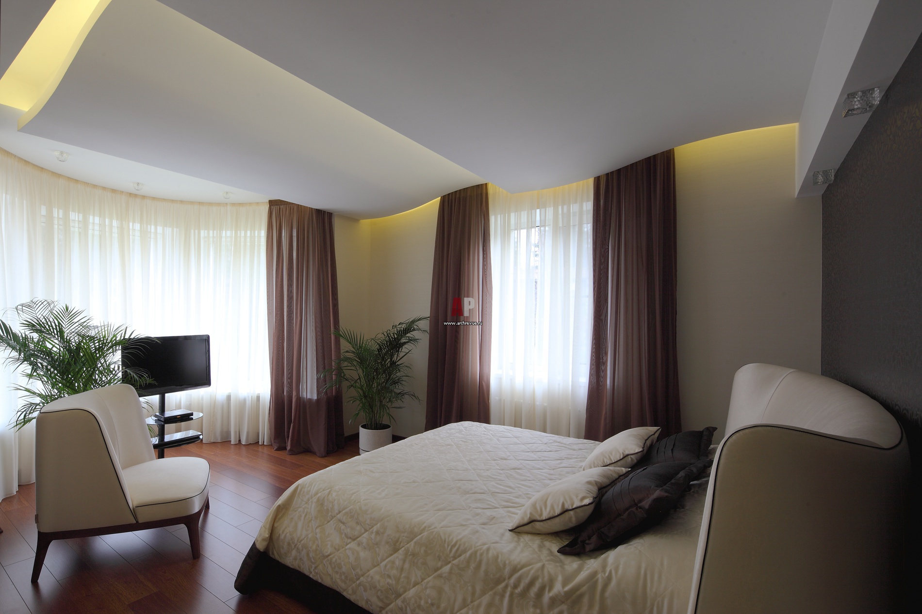 Особенность главной спальни – многоуровневый декор потолка. Он сделан в форме волны или каскада. Конструкция оснащена подсветкой с теплым фильтром.