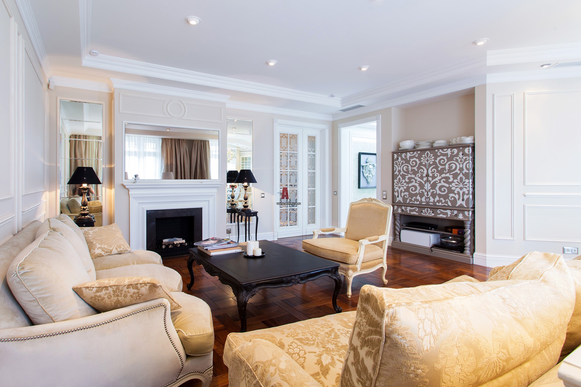 Настроение гостеприимного загородного дома создает неоклассический камин в гостиной. Светлые стены украшены тонкой гипсовой раскладкой, распашные двери декорированы витражами с пескоструйным рисунком.