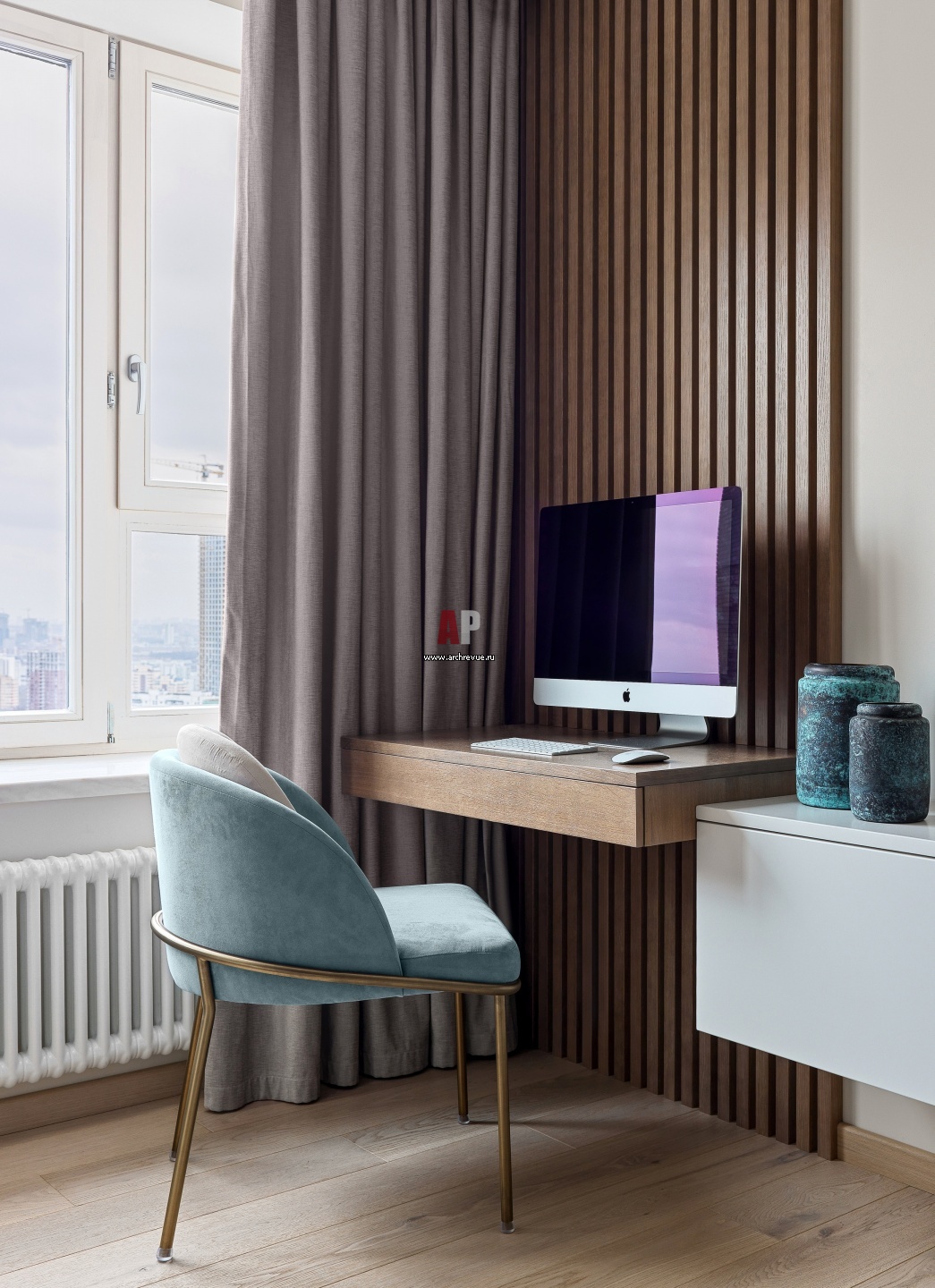 В кабинете интересное освещение, с круговыми светильниками. Помимо рабочей зоны здесь есть системы хранения, TV-зона и удобный диван для отдыха.