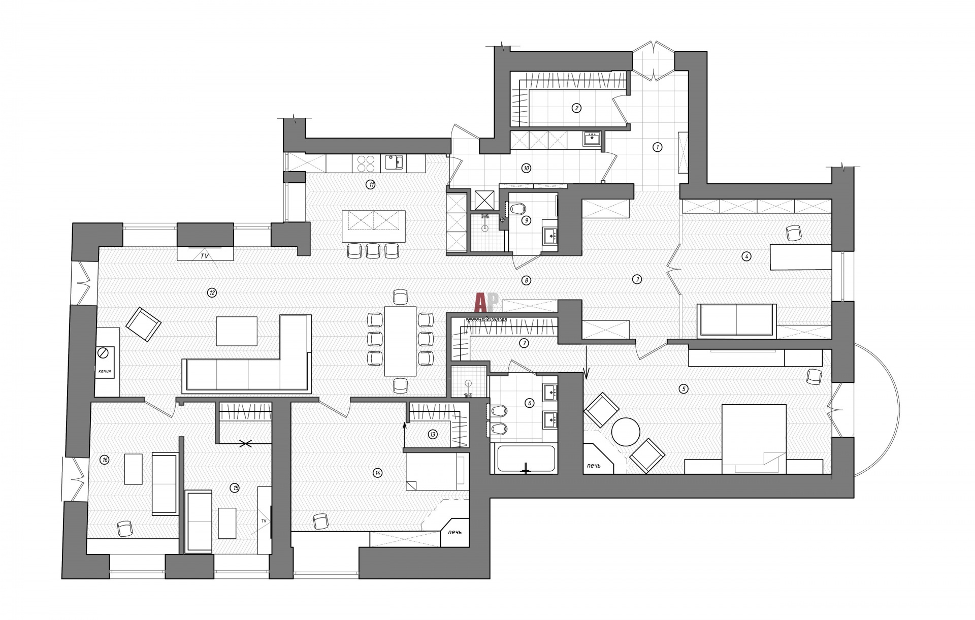 План большой квартиры в доходном доме в центре Санкт-Петербурга. Общая площадь – 230 кв. м.
