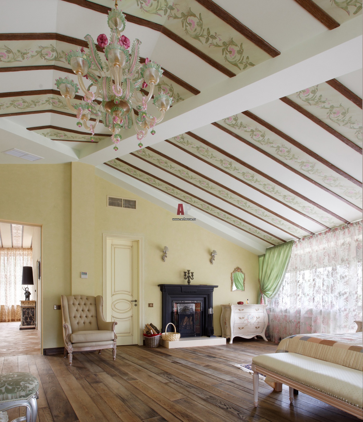 Зона камина в спальне. Чугунный камин, Stovax , поставщик «Интерьерный салон». Люстра, Murano Due из стекла розово-зеленых оттенков.