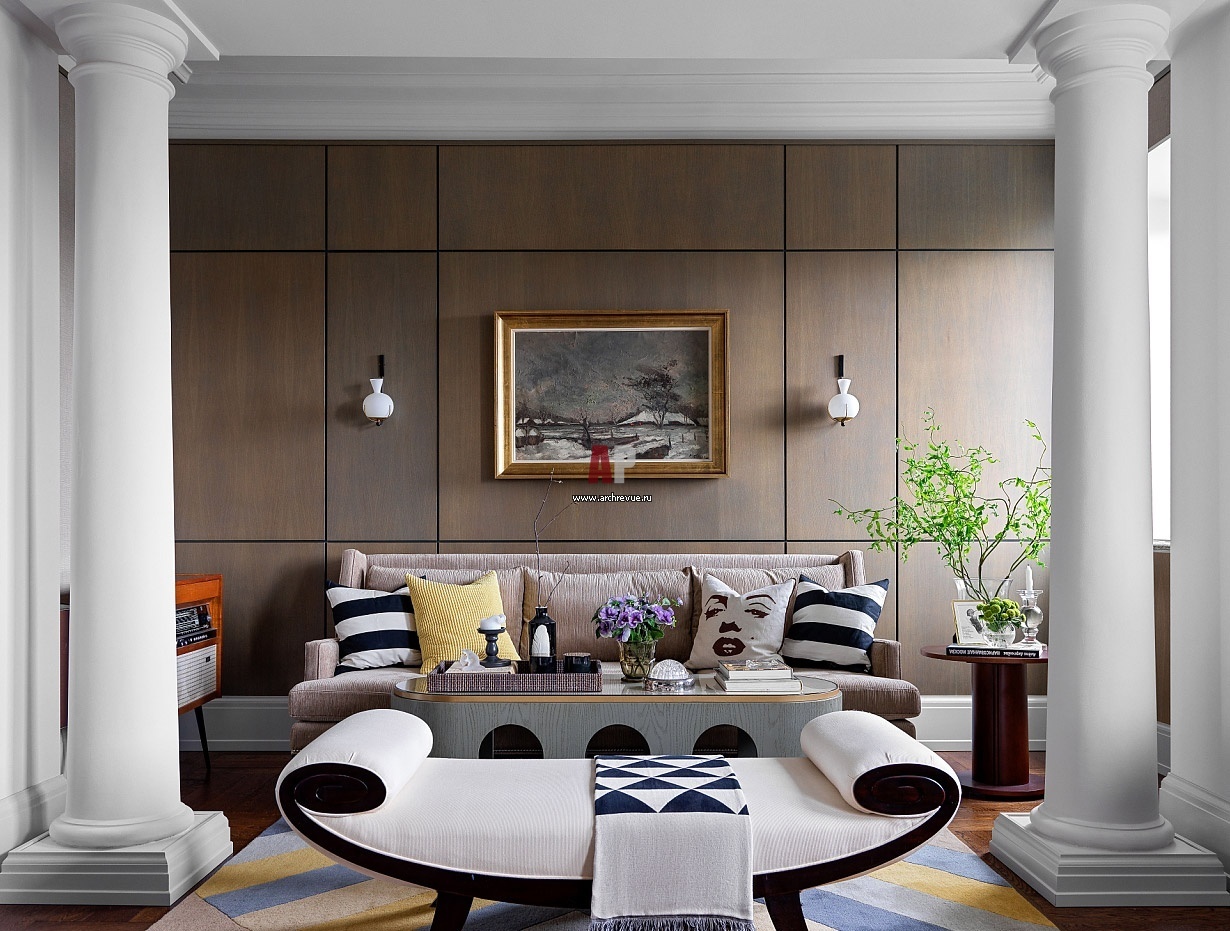 Украшение квартиры – «родные» колонны с тосканским ордером. Они образуют своего рода альков в гостиной. Стена за диваном зашита панелями из серого дуба, их масштаб и цвет выполнен по историческим образцам.