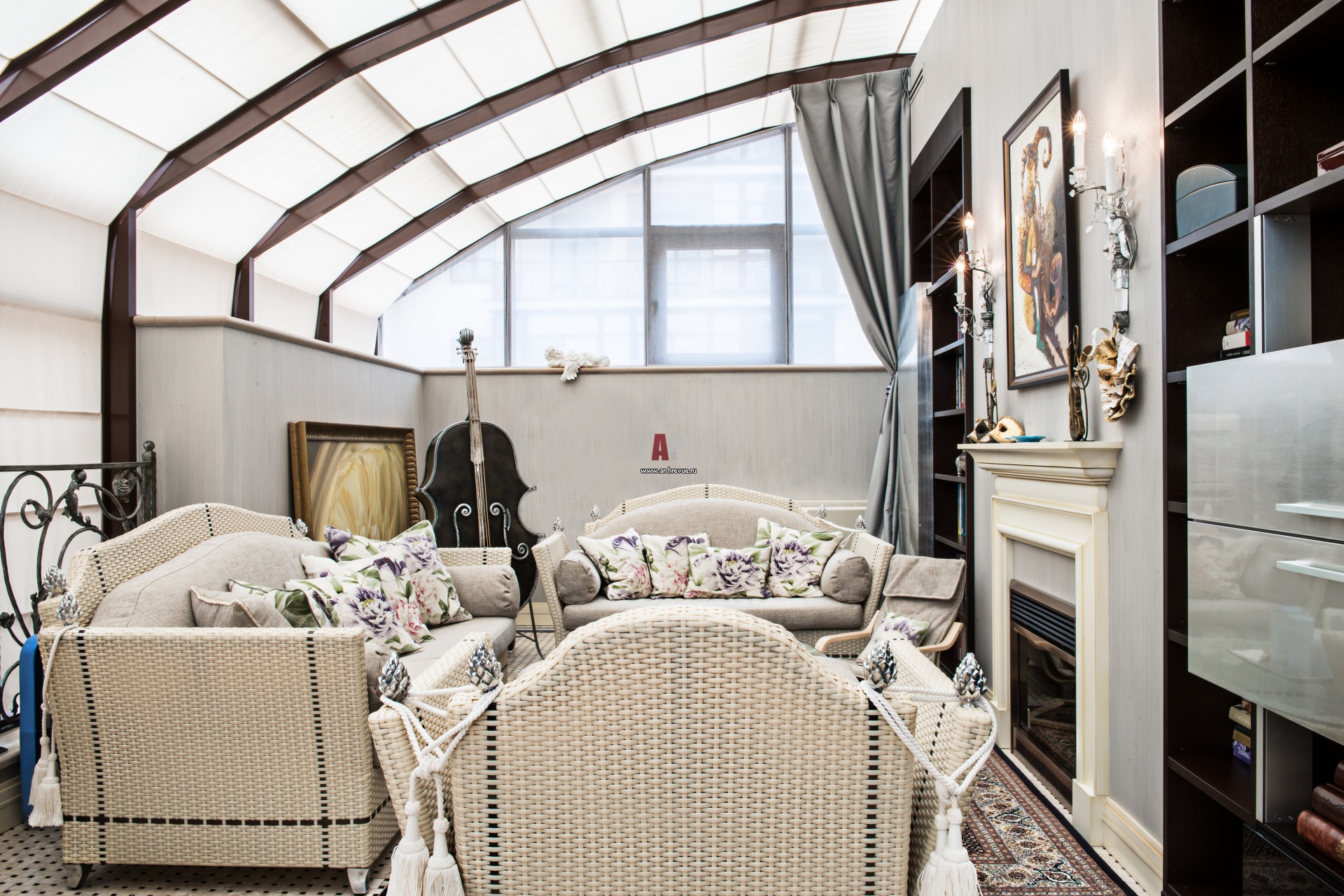 Огромная терраса со световым фонарем служит зимним садом и зоной отдыха с баром, камином и белой плетеной мебелью.