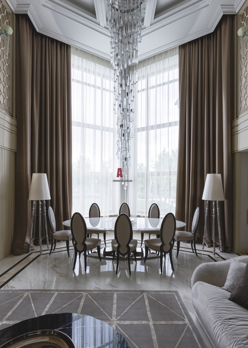 Парадная столовая в гостиной. Обеденный стол, стулья DV homecollection. Над столом – люстра Il Paralume Marina из муранского стекла высотой 4, 5 метра и весом 115 кг. Каждая капля набиралась вручную, на сборку люстры ушло несколько дней.