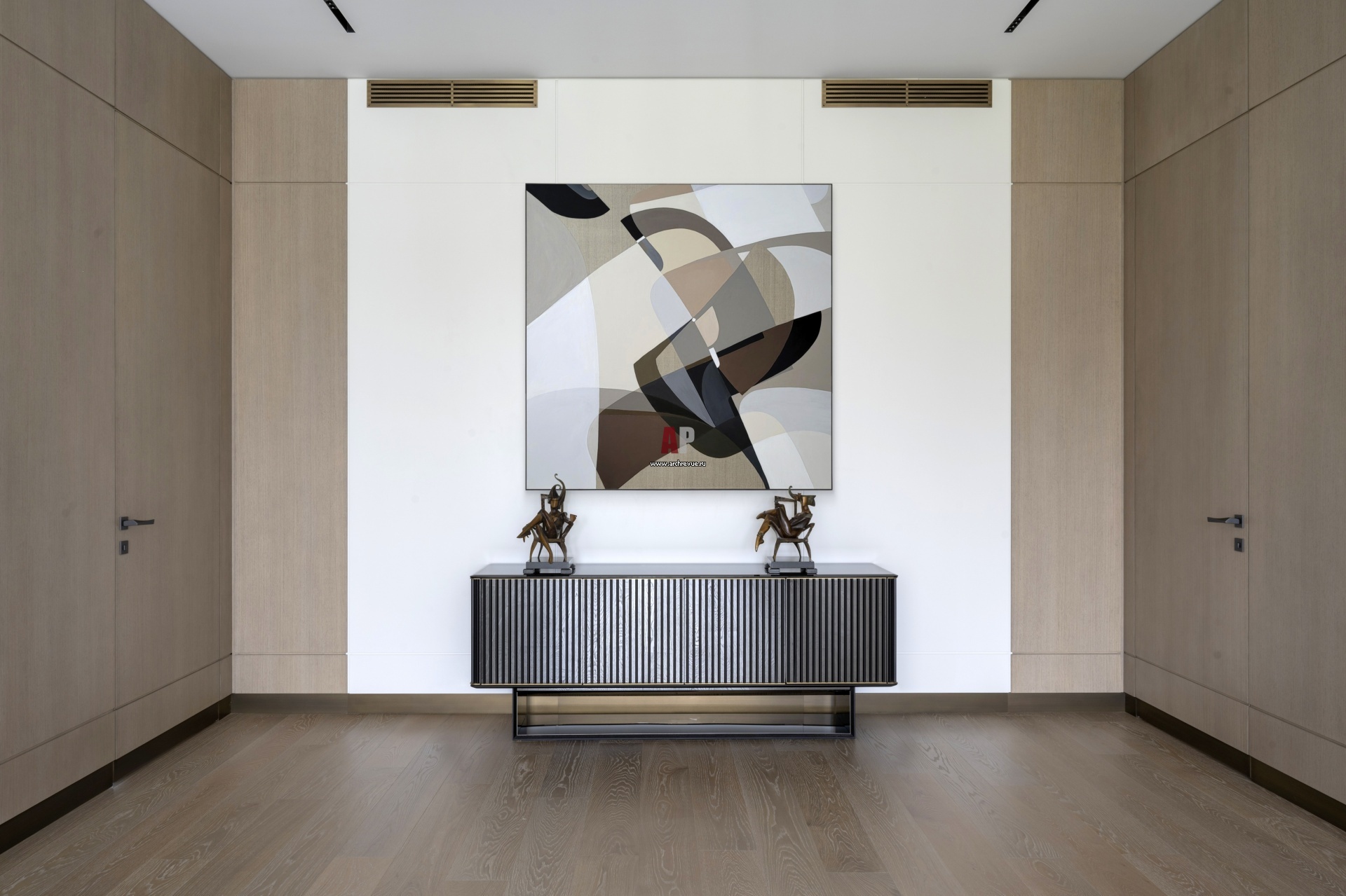 Холл второго этажа. Мотив стеновых панелей повторят отделку первого этажа. Комод, Gallotti & Radice. Картина Татьяны Кириковой.