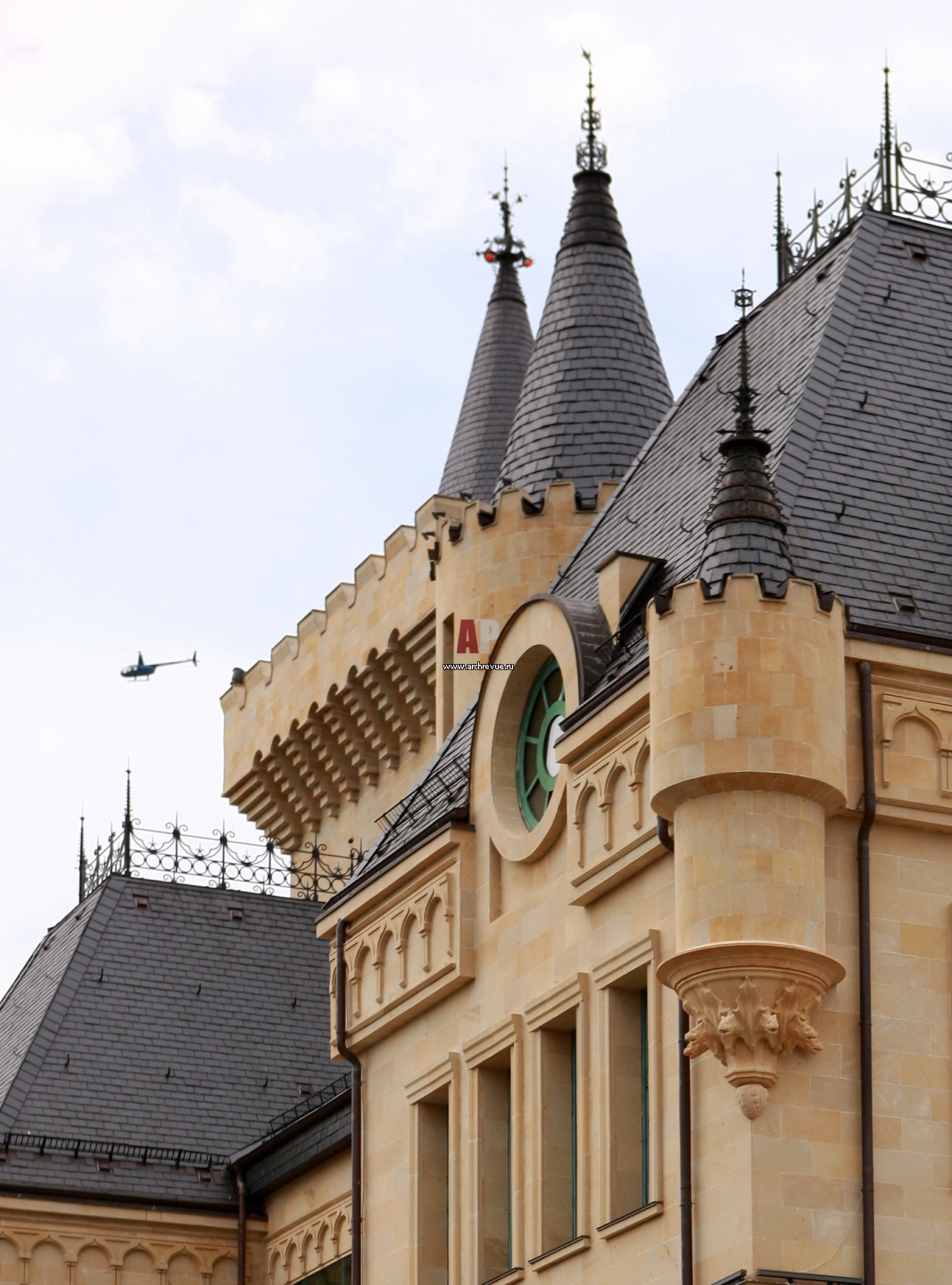 Фрагмент главного фасада замка. Все окна в особняке сделаны по эскизам авторов проекта на итальянском производстве Capoferri, поставщик «Стелс». Оконные рамы сделаны из дуба, с фасада они украшены медными накладками. Круглые окна открываются на 180 градусов.