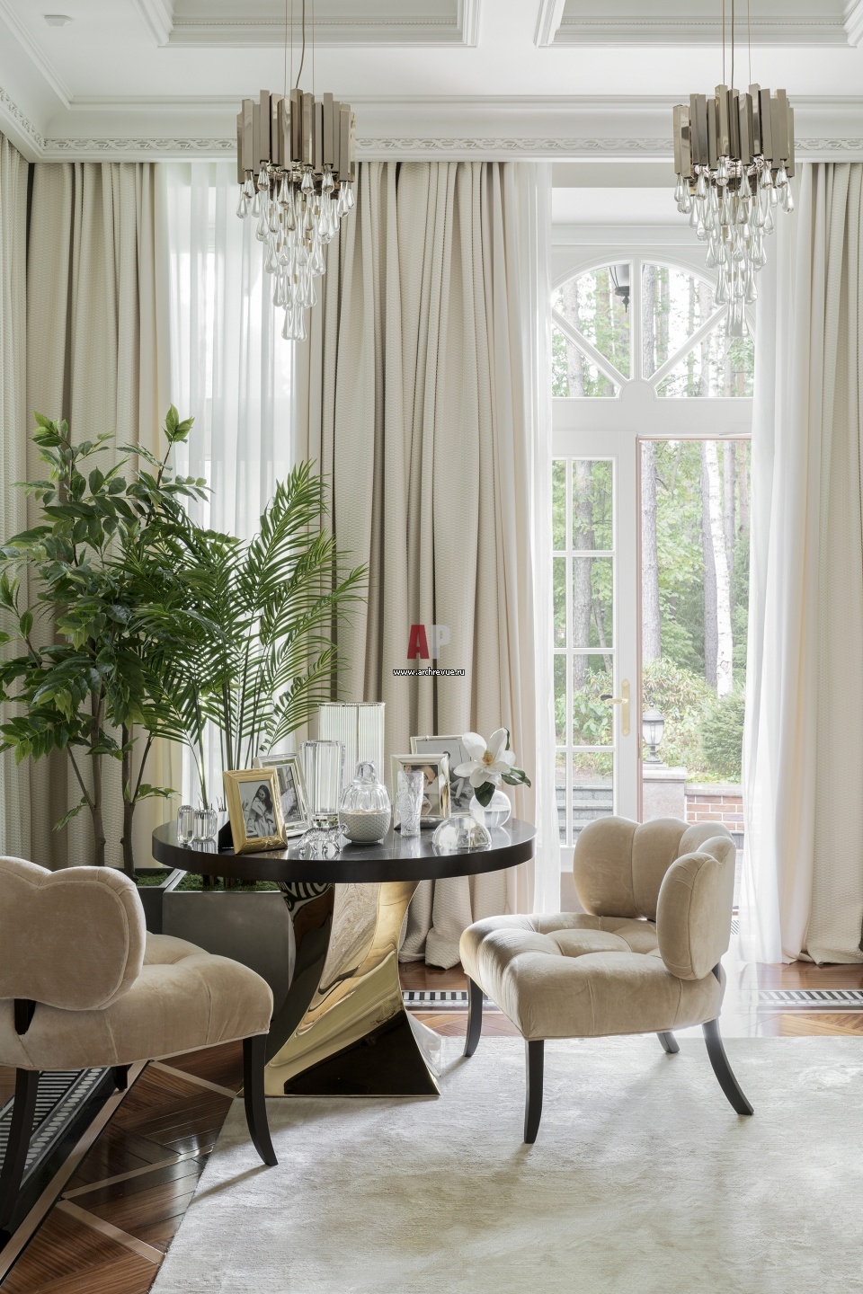 В спальне помимо большой кровати со стилизованным балдахином в изголовье есть небольшой круглый стол для утреннего кофе, Caracole. Кресла, Haute House.