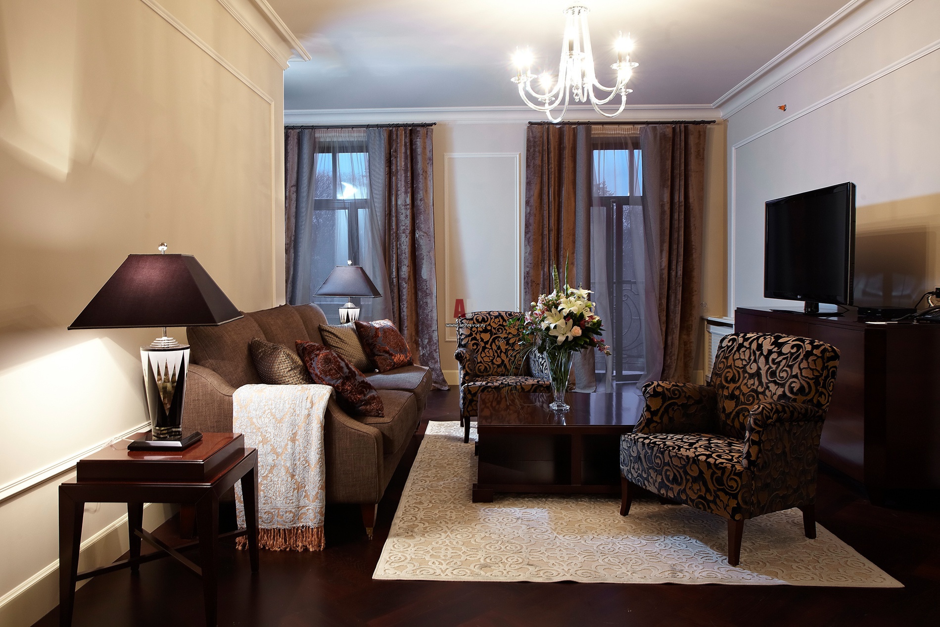 Интерьер гостиной номера отеля класса «Люкс». В цветовой палитре преобладают бежевый, коричневый и фиолетовый цвета.