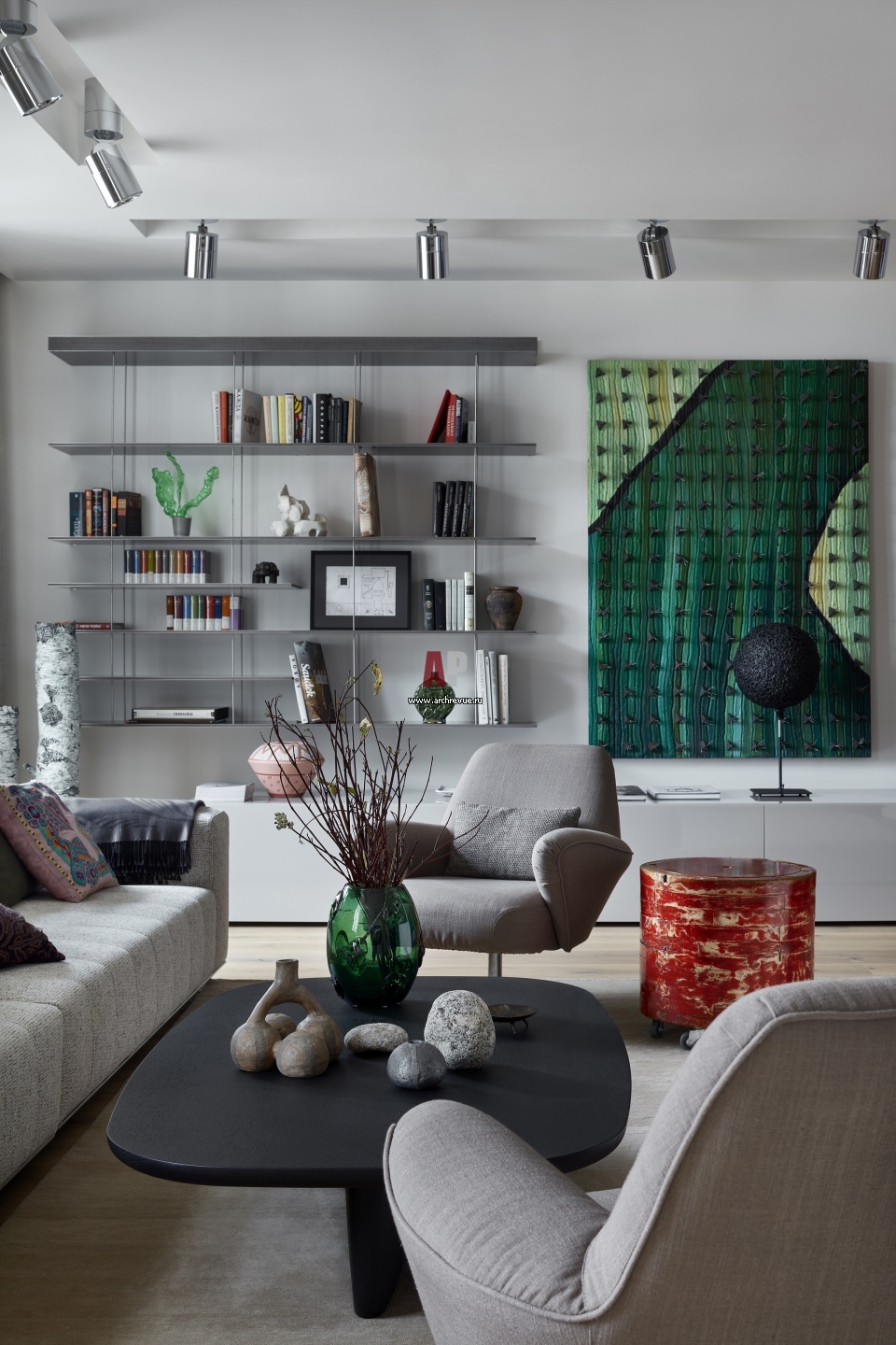 Гостиная задумана как свободное пространство для общения. Слева у окна – арт-объект Аполлинарии Броше «Березки». На кофейном столике – камни, привезенные с берегов французской реки Тарн.