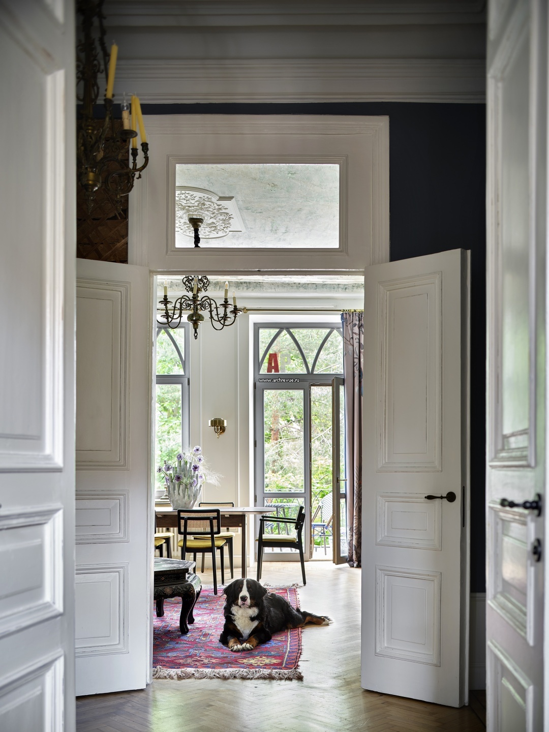Вид из холла на гостиную-столовую. Высоки распашные двери с фрамугами – аутентичные. Из бережено отреставрировали.