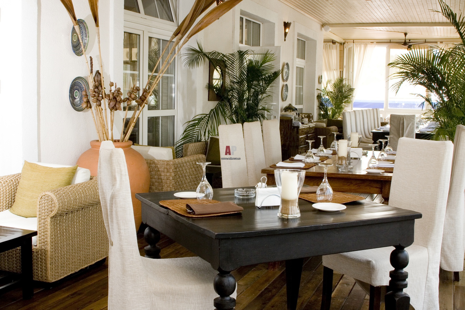 Интерьер веранды ресторана в светлой цветовой гамме. Садовая плетеная мебель, белый текстиль и напольные вазы из глины терракотового цвета создают ощущение приморской виллы.