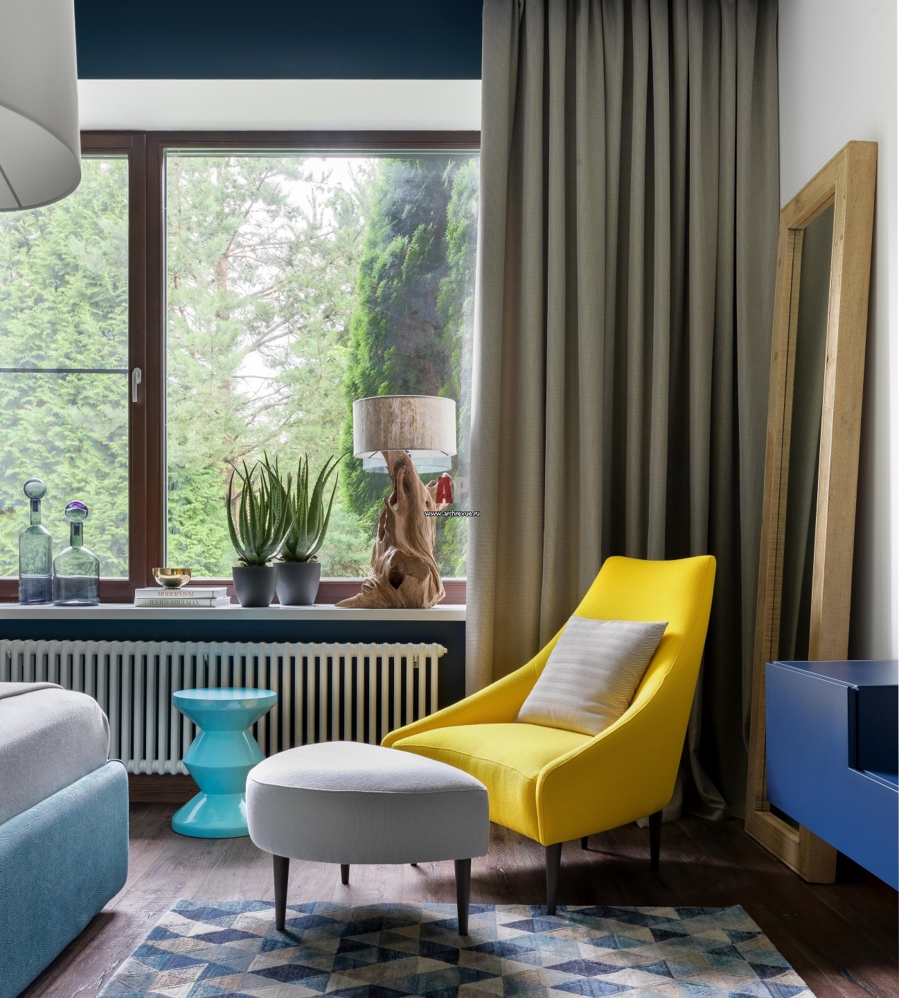 Зона отдыха с желтым креслом в одной из спален второго этажа.