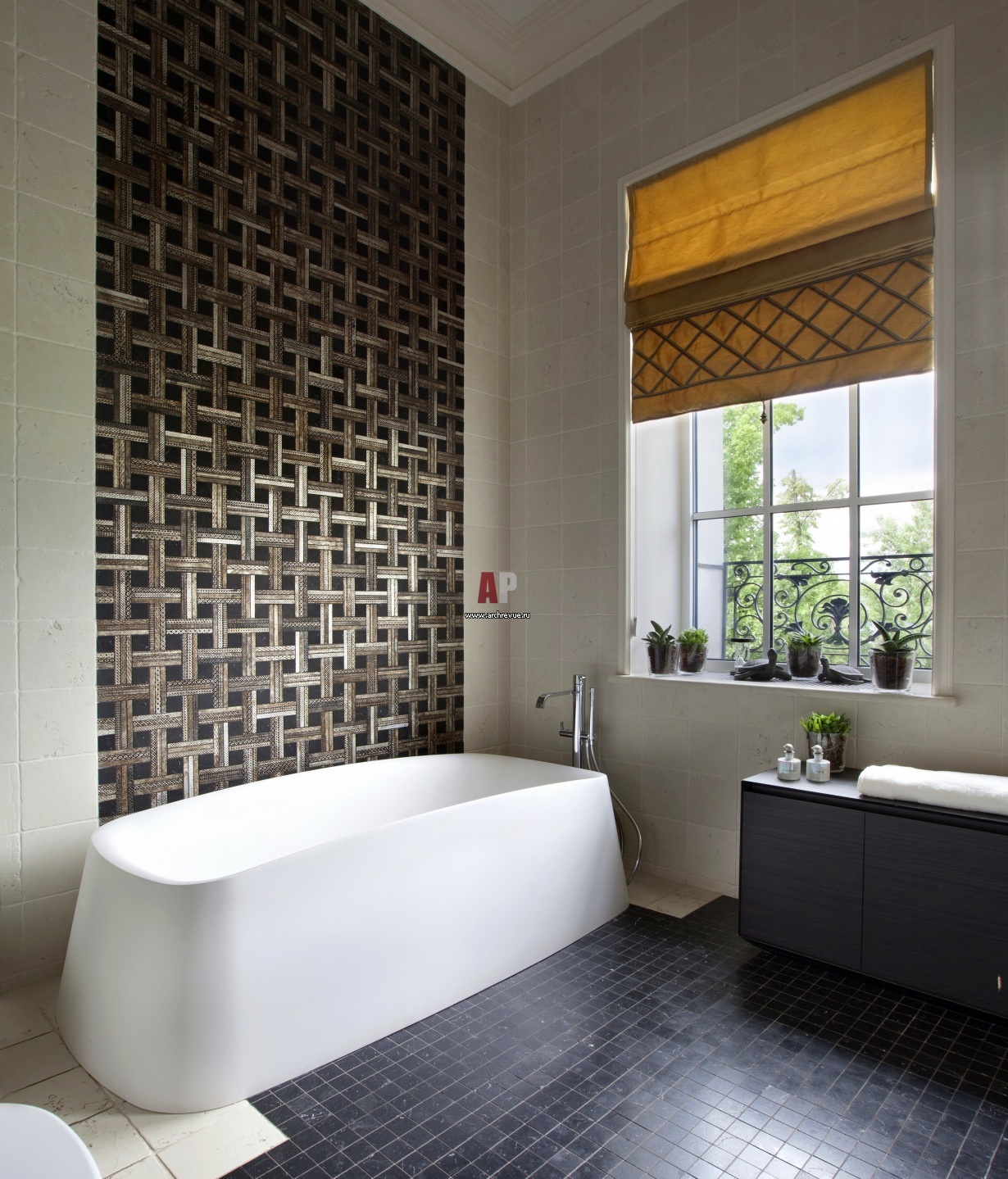 Интерьер одного из санузлов в современном стиле. Стена за ванной отделана каменной мозаикой.