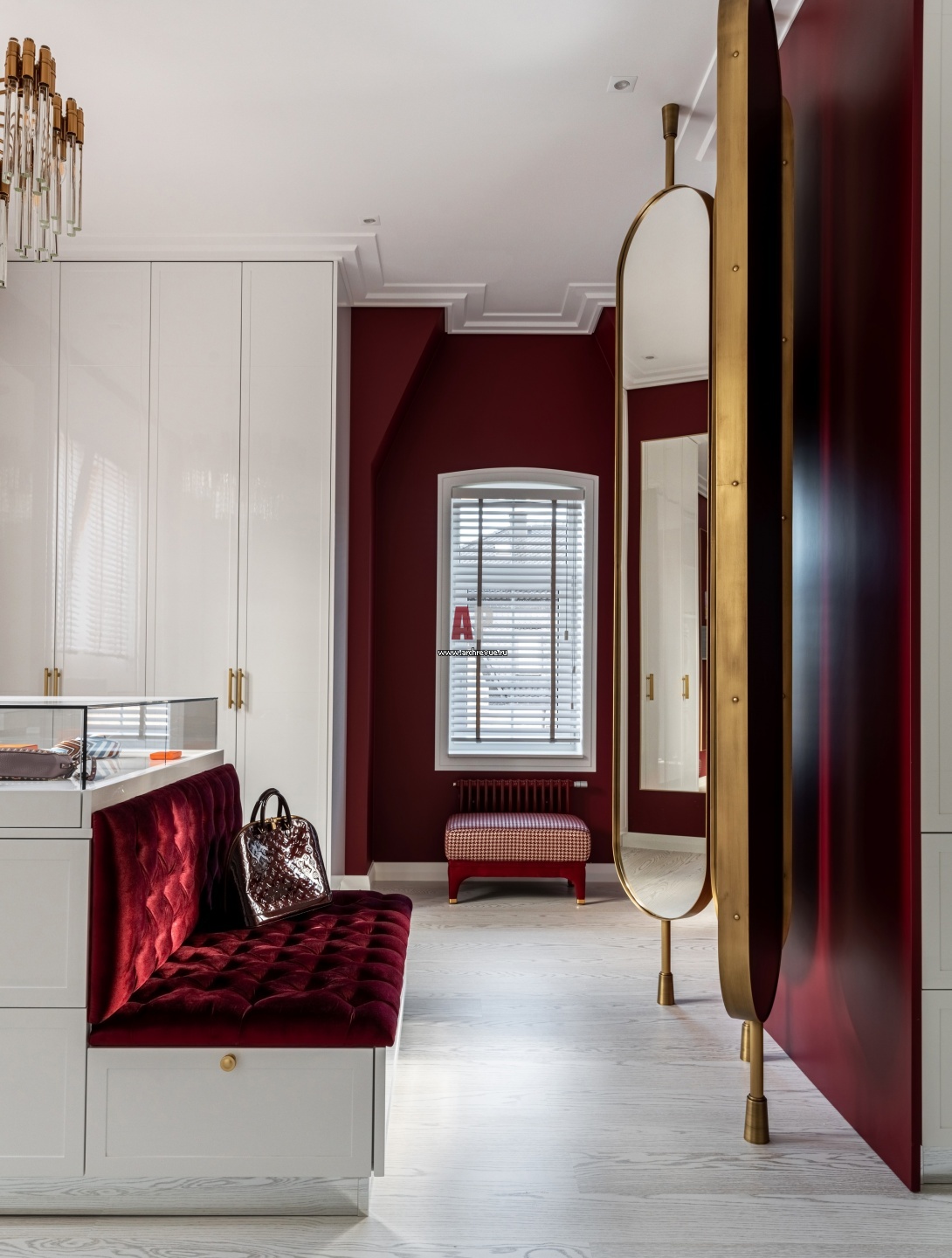 Гардеробная при спальне хозяев напоминает роскошный будуар. Стены окрашены краской насыщенного винного оттенка из палитры голландского бренда Ralston. Напольные зеркала сделаны на заказ. Мебельная фурнитура, Armac Martin, Великобритания.