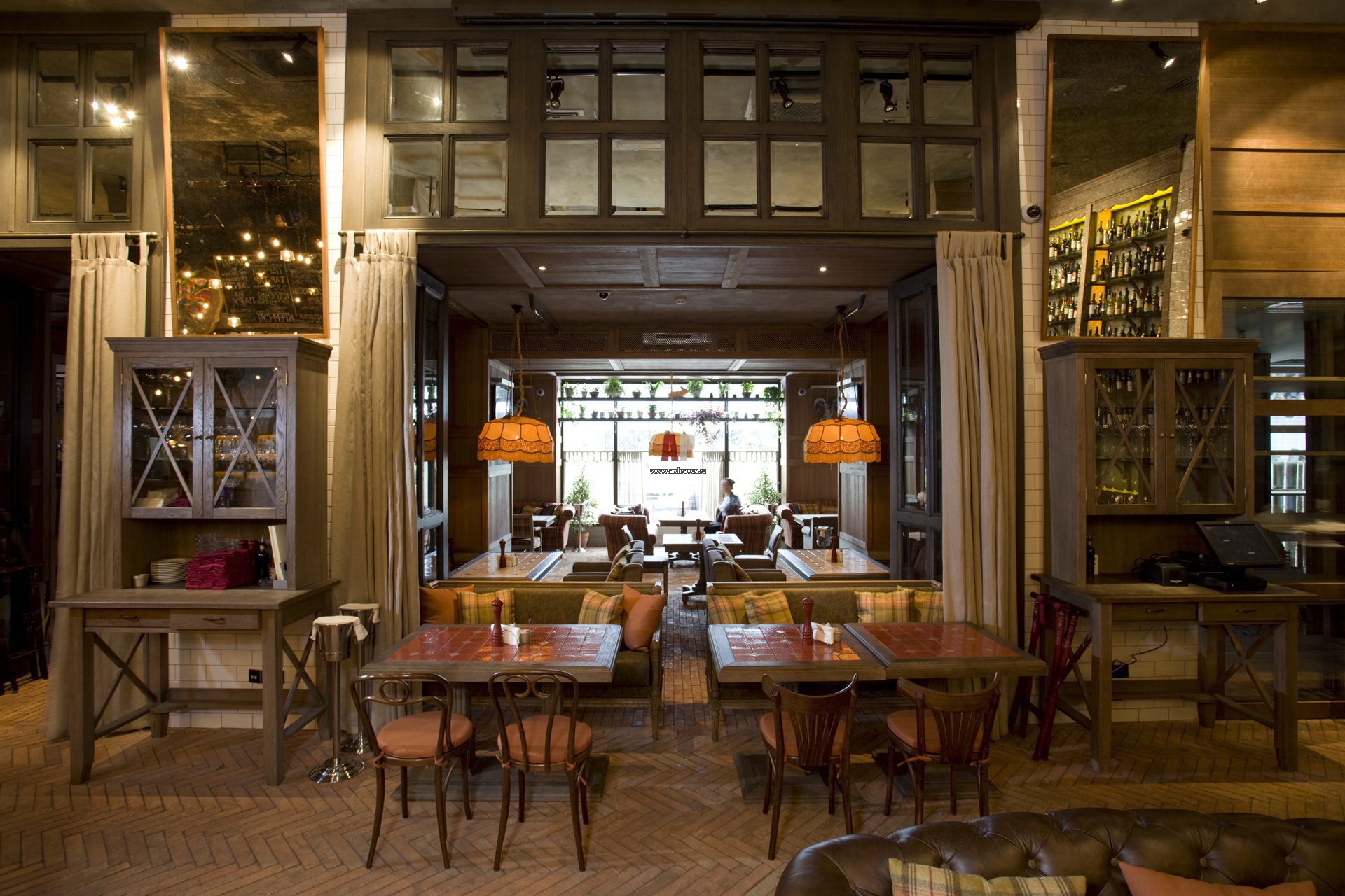 Интерьер зала ресторана в стиле фьюжн. Настенные панели и оперативная мебель из грубого, необработанного дерева.