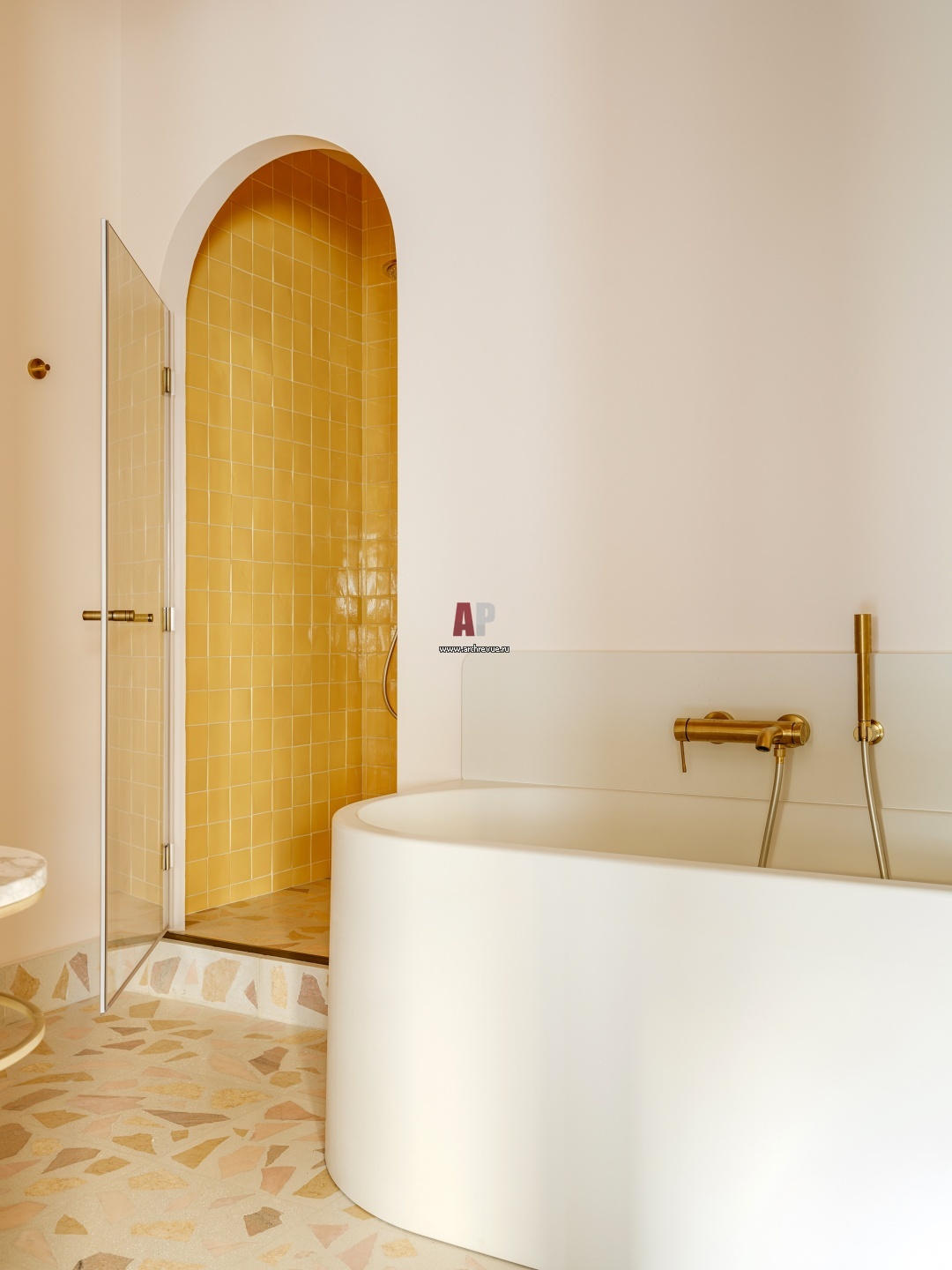 Техника террацо в отделке пола ванной приглушила насыщенность розового, разбавить его дымчатым бетоном, и позволила добавить вкрапления желтого мрамора, чтоб плавно подвести к душевой с отделкой из керамической плитки ручной работы канареечного цвета.