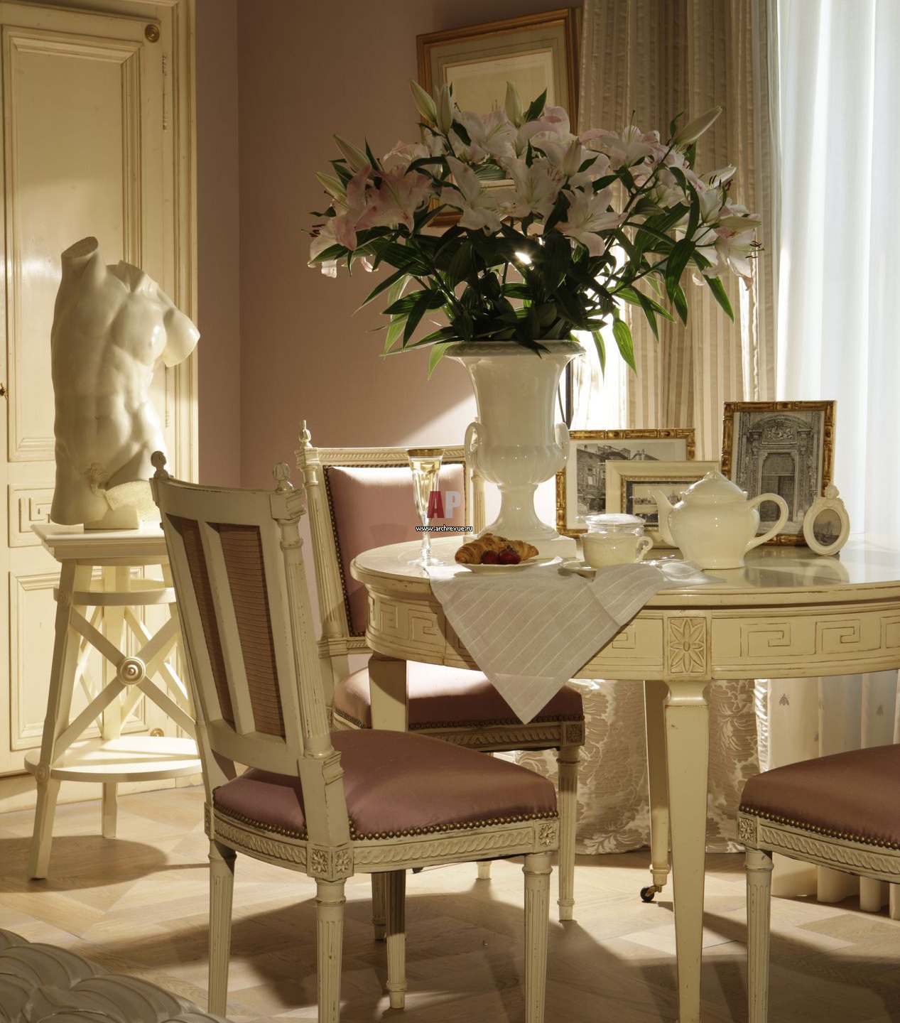 Хозяйская спальня разделена на две зоны: собственно спальню и небольшую гостиную со столиком для завтраков Moissonnier.