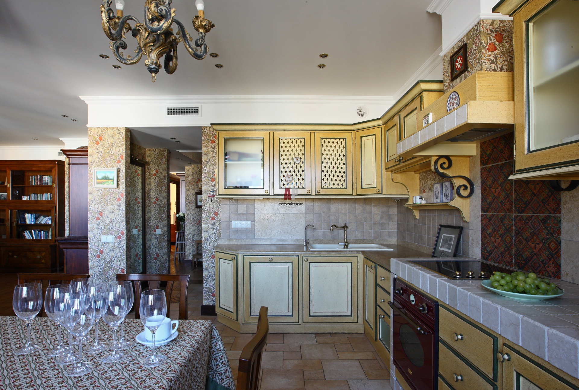 Кухня включена в общую зону квартиры. Ее интерьер выполнен в стиле американского кантри. Столешница и фартук облицованы грубой плиткой под камень.
