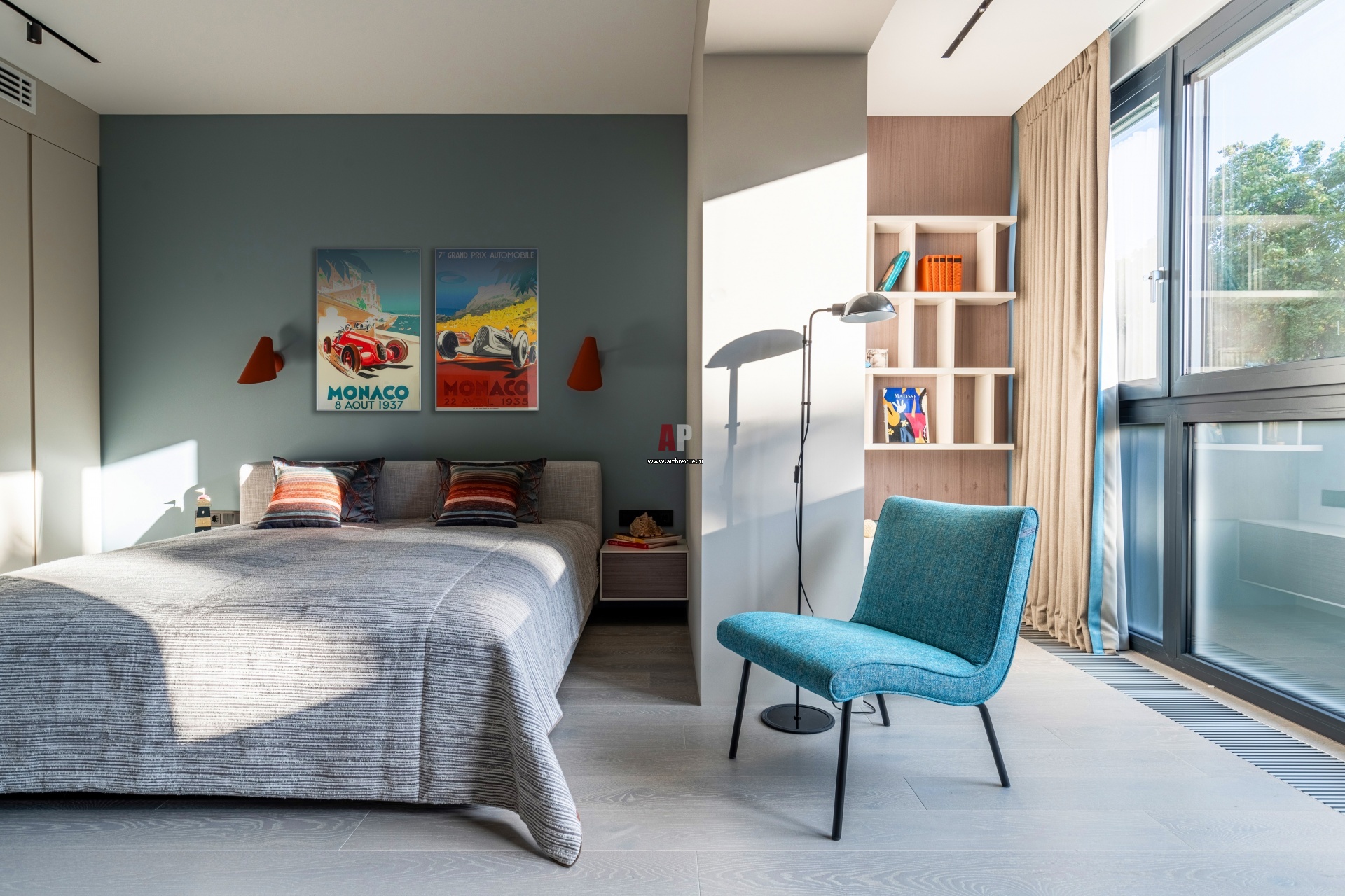 Стены одной из детских выкрашены в яркий серо-голубой оттенок. Краска, Benjamin Moore, корпусная мебель изготовлена на заказ. Кресло, Walter Knoll, модель Vostra. Торшер, Marset.