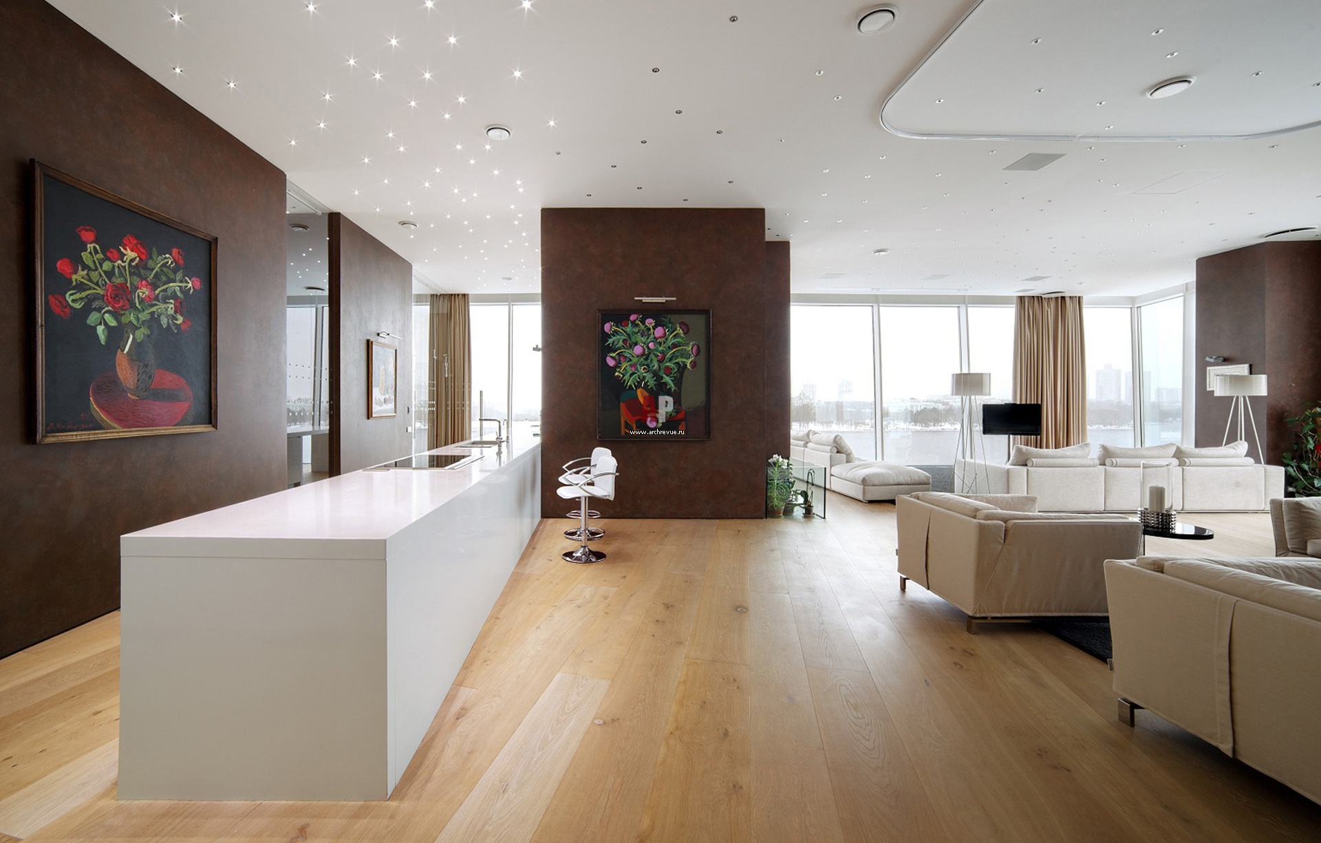 Кухонная мебель имеет большие габариты, характерные для американской мебели. Белый 8-ми метровый кухонный остров зонирует общую зону.