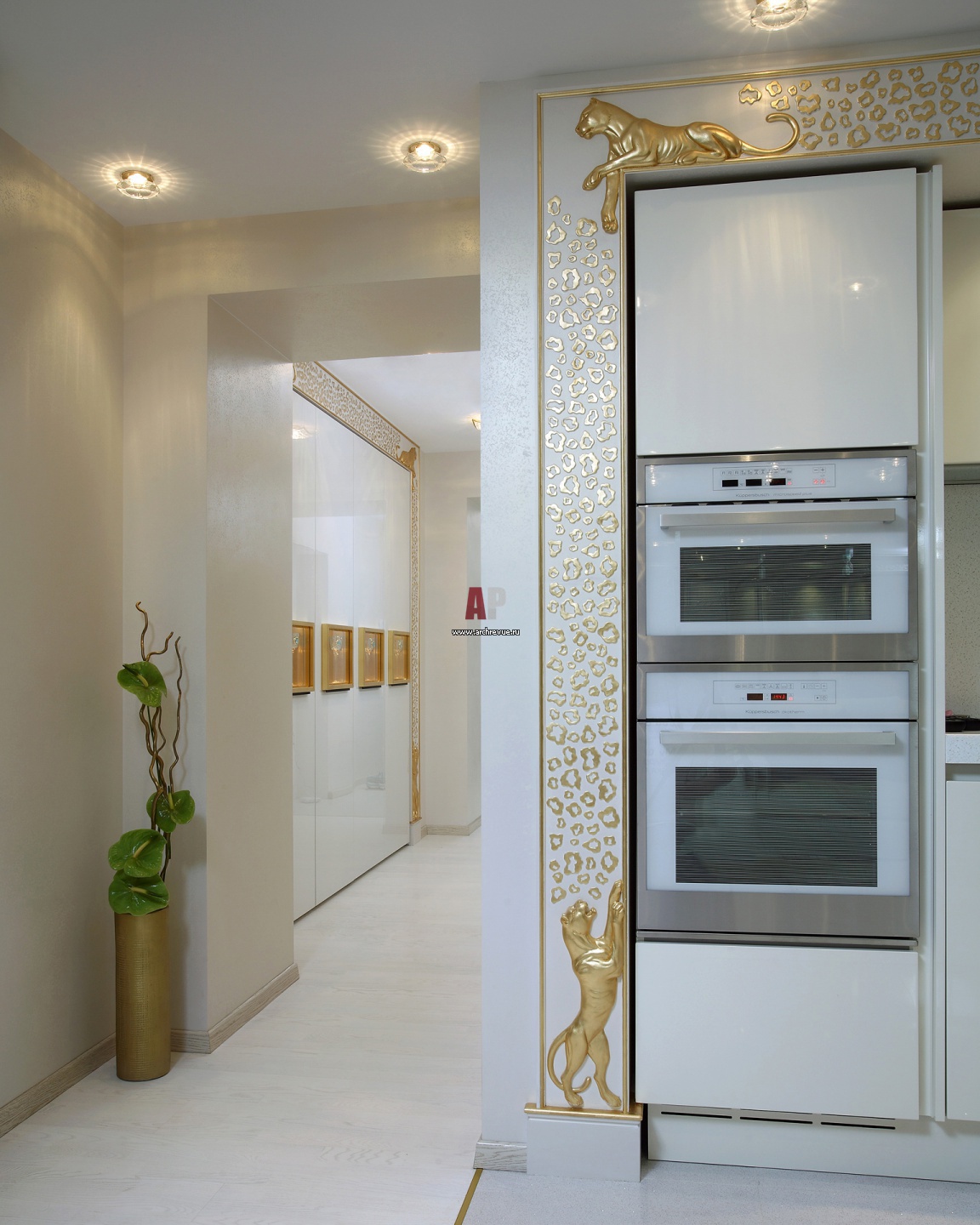 Интерьер квартира в стиле гламур. Кухня с белыми глянцевыми фасадами Cesar оформлена по периметру декоративным кантом с гипсовыми барельефами. На стенах – покрытия «жидкий шелк» теплого оттенка с перламутровым напылением. Декоративные покрытия Sikkens, поставщик «Дом Краски / Деко – Эм».