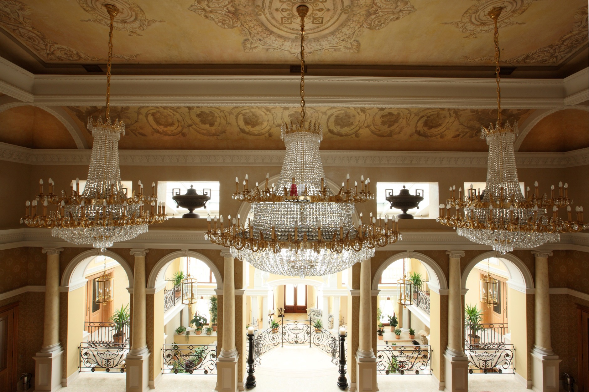 Полукруглые проемы и декоративные ниши дают возможность видеть всю центральную часть дома – гостиную, зимний сад, фасадный витраж, а также грандиозные люстры и потолочную роспись.