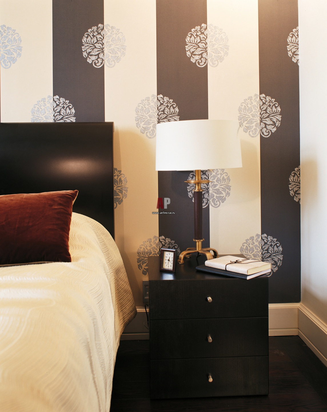 Спальня решена в бежево-шоколадных оттенках. С обоями в полоску гармонирует текстиль. Покрывало, Armani Casa. Коричневые бархатные подушки, Maison de Vacances. Кровать, прикроватный столик, Modenature.