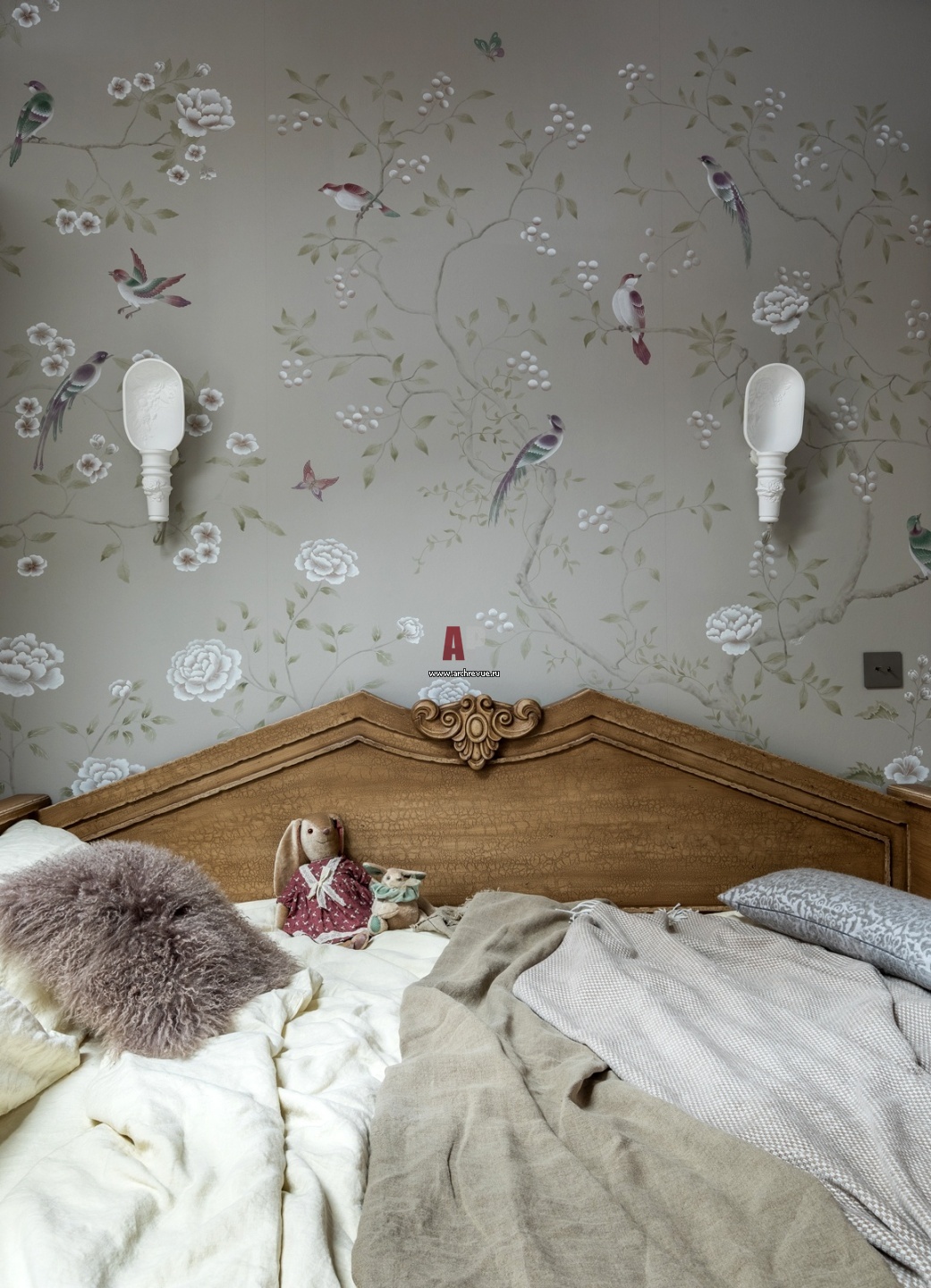 Интерьер детской. Кровать сделана на заказ по эскизам авторов проекта. Обои, Fresq.