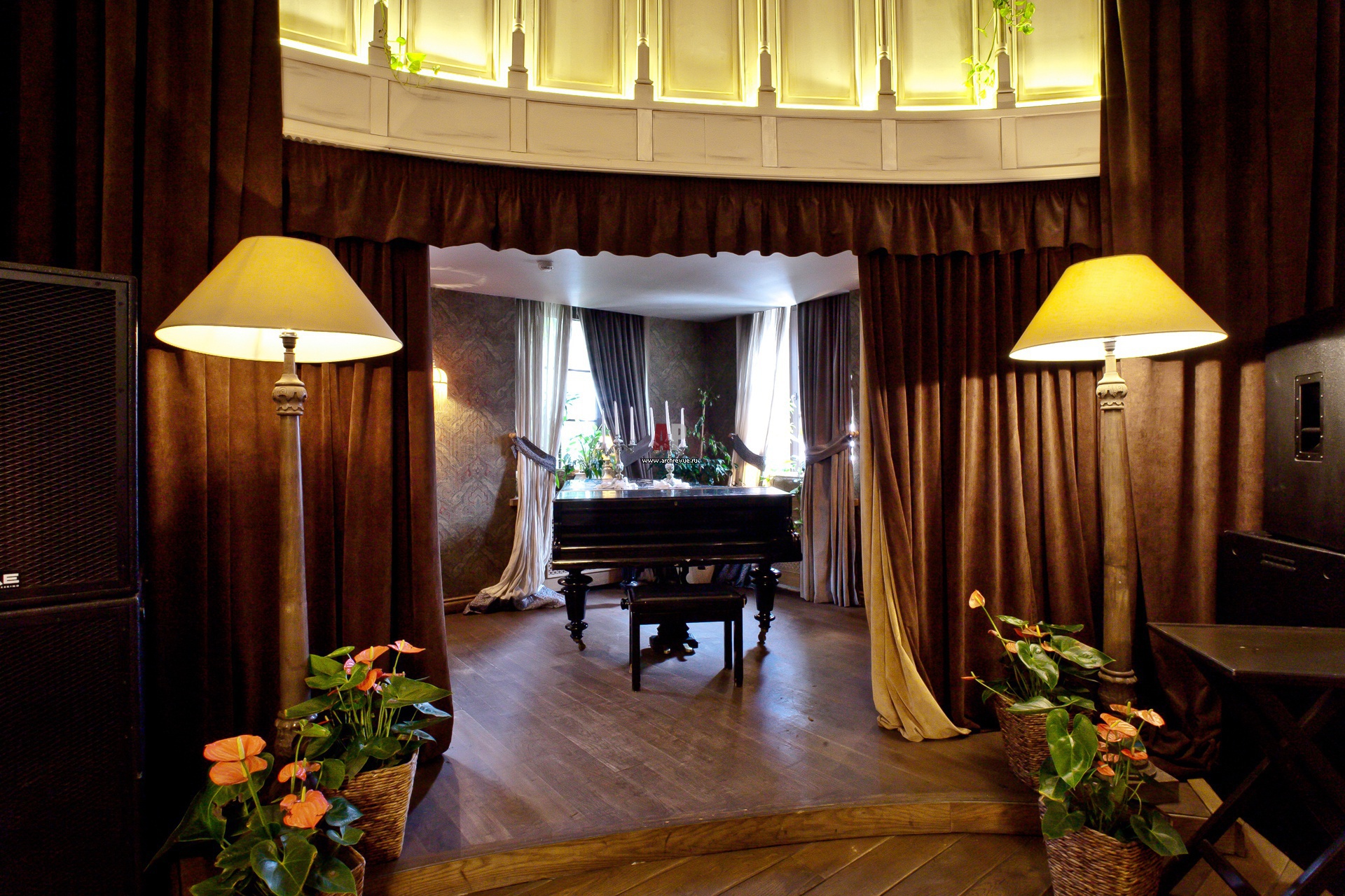 Сцена для живых выступлений с роялем похожа на домашнюю музыкальную гостиную. Занавес из бархата.