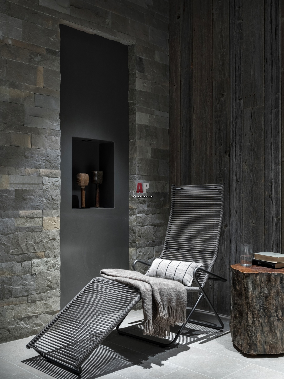В зоне СПА и бассейна использовались большие поверхности из темного колотого натурального камня (сланца) и амбарной доски.