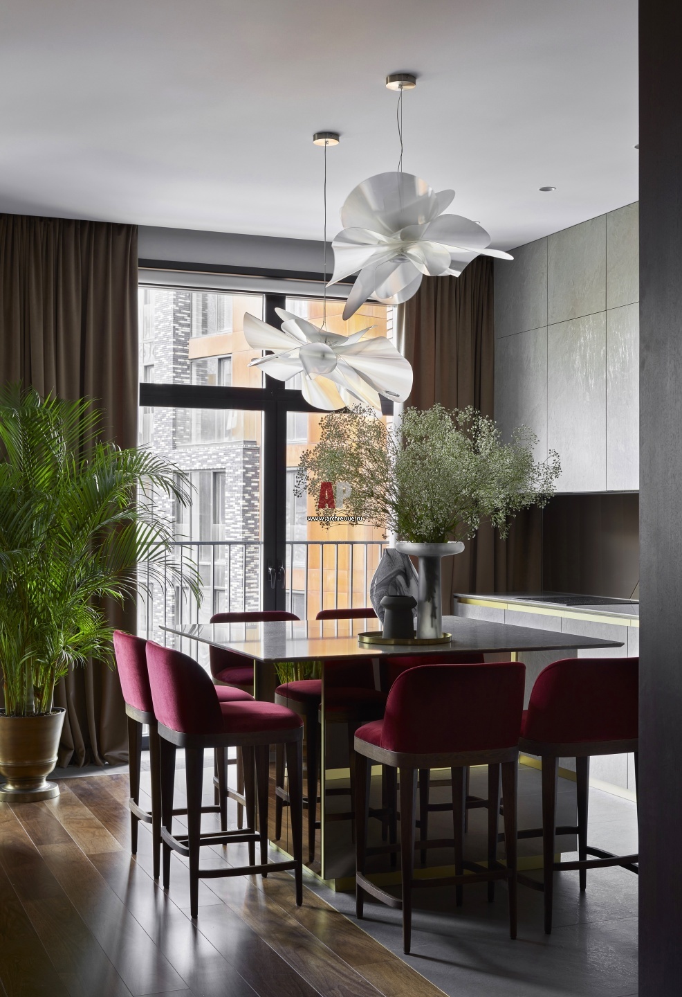Кухня-столовая. Вместо обеденного стола – компактный барный остров с полубарными стульями. Столешницы выполнены из композита кварца Cambria. Подвесные светильники, Slamp.