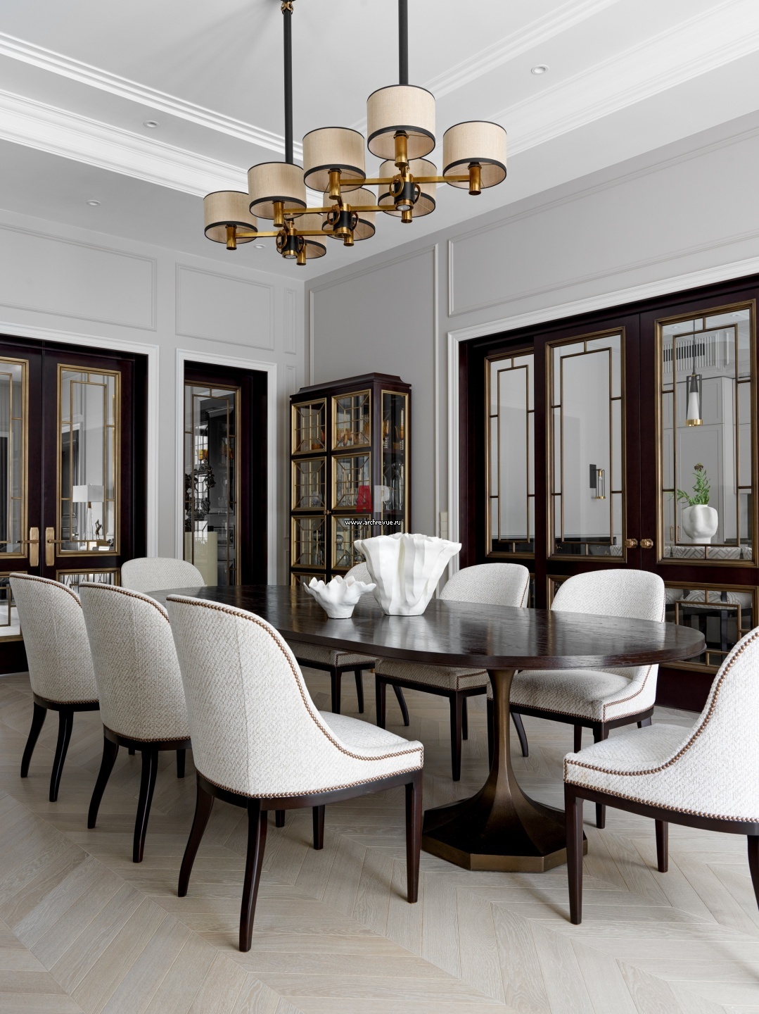 Зона столовой в стиле ар-деко. Стол, Century Furniture. Белые стулья, Mr. & Mrs. Howard. Витрины-буфеты входят в авторскую мебельную линию Полины Пидцан.