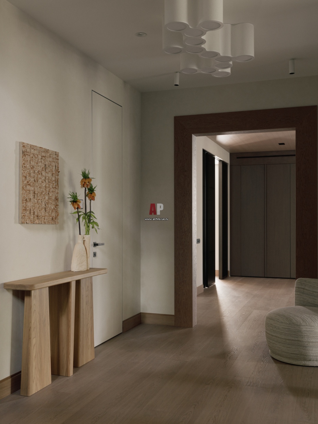 Холл наполнен природными мотивами. Палитра выдержана в мягких естественных тонах. Мебель выполнена на заказ и повторяет природные формы.