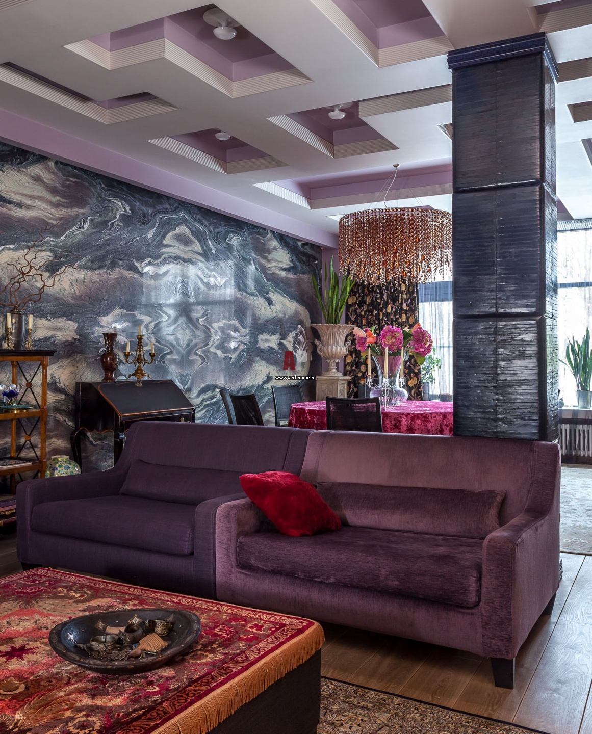Зону отдыха от столовой зрительно отделяет несущая колонна. Она зашита панелями, набранными из тонких горизонтальных полос темной кожи. Кресла обиты шинилом двух оттенков сиреневого цвета.
