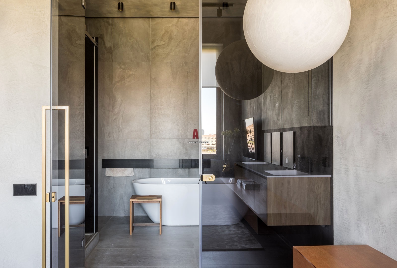 Выход в ванную комнату сделан из спальни. Она отелена перегородкой из тонированного стекла. Светильник-шар, Davide Groppi. Отделка стен – бетон.