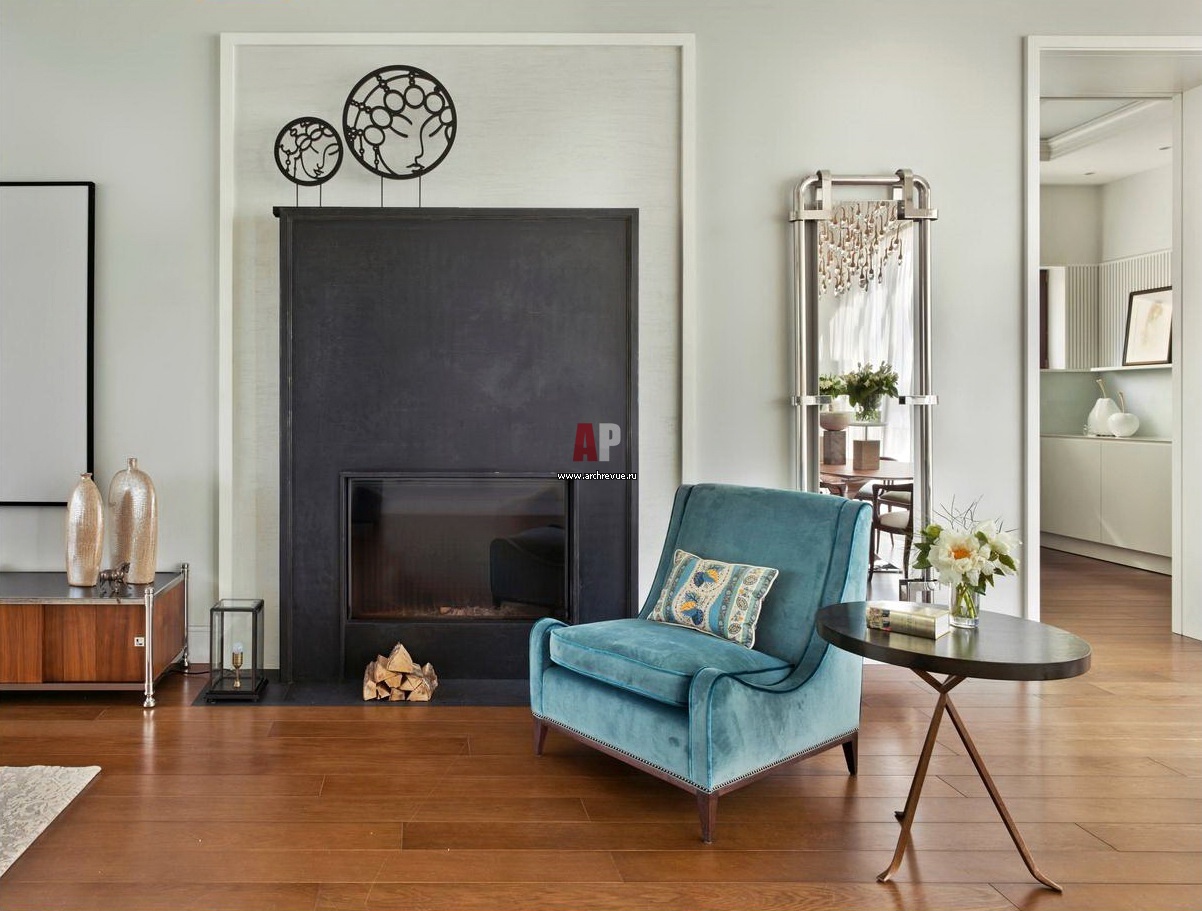 Зона камина в гостиной. Портал камина выполнен из черного металла. Кресла, Amy Somerville. Столик, Julian Chichester. Свет, Eichholtz.