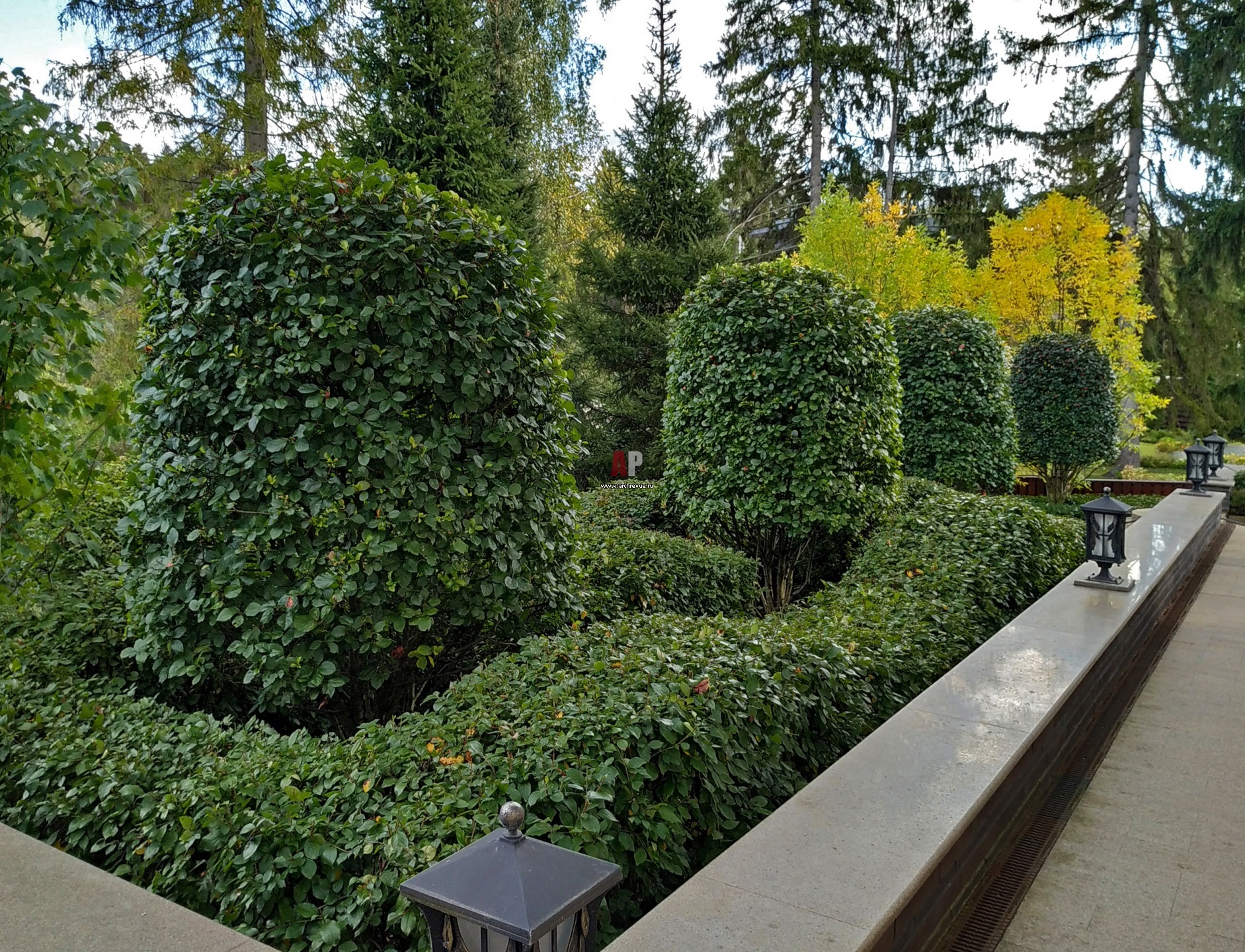 Ландшафтный дизайн участка в Подмосковье. Регулярный сад, окружающий патио у дома.