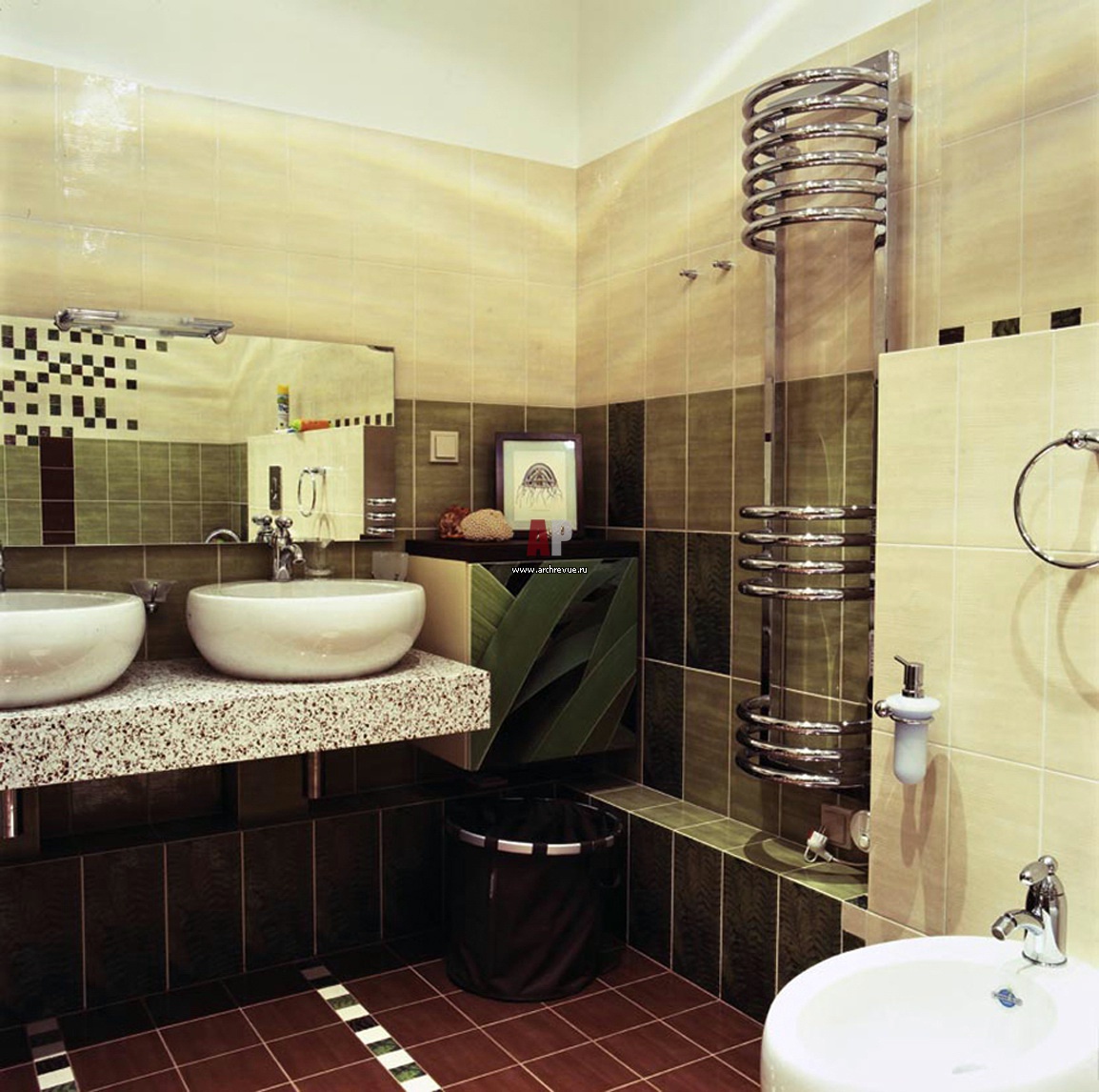 Тема оформления гостевого санузла – азиатские джунгли. Керамическая плитка в коричнево-зеленой цветовой гамме с изображением листвы. Умывальники – круглые.