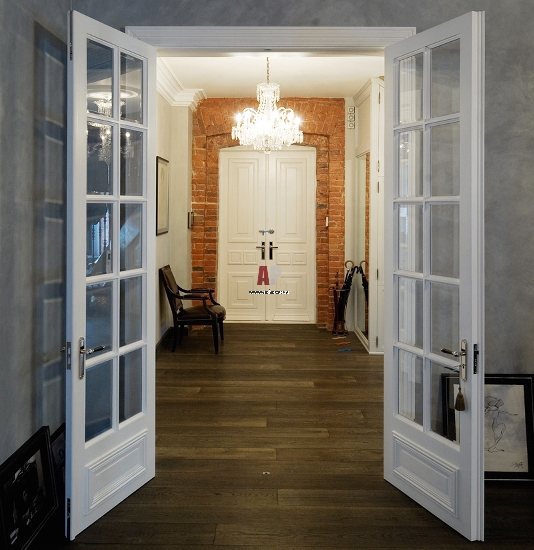 С красными кирпичными стенами в прихожей контрастируют распашные двустворчатые двери белого цвета с витражами. Стены гостиной отделаны декоративным финишем, художник наносил его вручную.