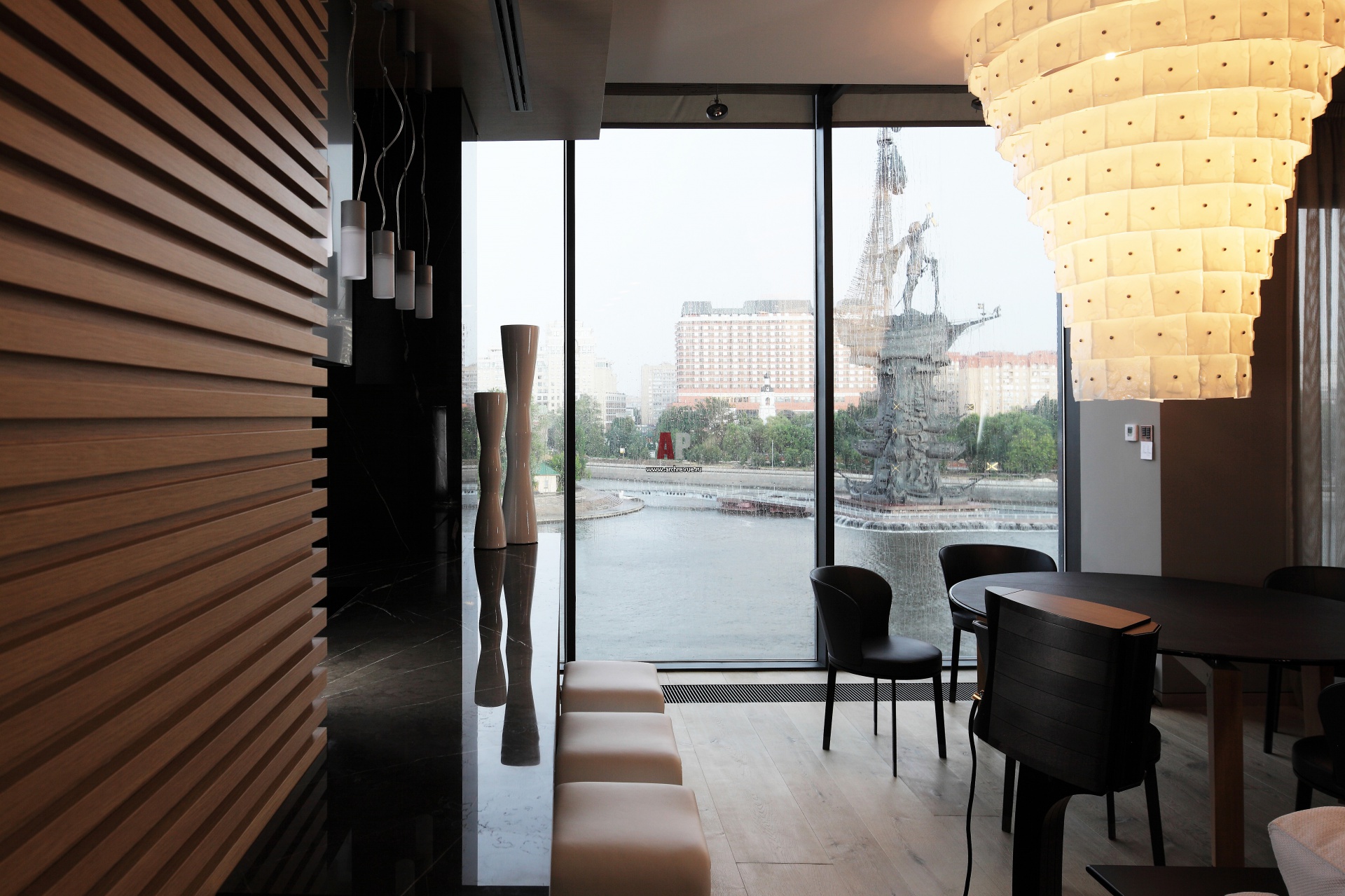 Фото интерьера столовой зоны в пространстве гостиной-студии. Люстра из муранского стекла сделана на заказ на фабрике Venini.